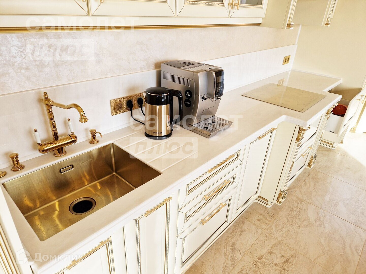 Пространство кухни, интегрированное в гостиную представляет собой идеальное сочетание функциональности и стиля для комфортного проживания. Здесь есть все необходимое для приготовления пищи и отдыха, начиная от измельчителя мусора до кофемашины.