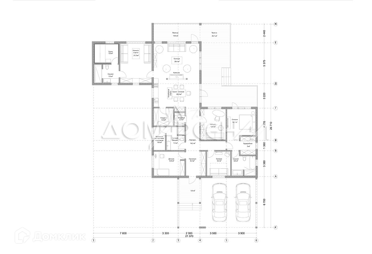 Единым пространством кухня-гостиная-столовая 50 кв.м с видовыми окнами в пол и выходом на просторную террасу 65 кв.м, мастер-спальня с ванной и гардеробной, детская, кабинет, гардеробная или гостевая спальня, еще мастер блок с ванной и гардеробной, при кухне вместительная кладовая, гостевой с/у и  постирочная/кладовая, котельная, навес на 2 а/м.