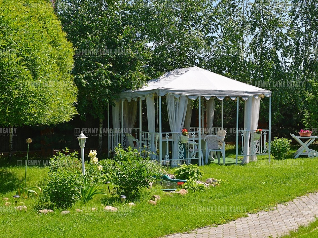 На участке проведены ландшафтные работы, высажены деревья, дорожки, освещение, есть беседка с прудом и гараж с домом для охраны.