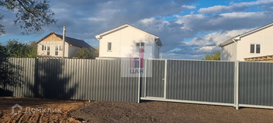 Площадь участка 10 соток, огорожен забором из профнастила с калиткой и откатными воротами, сделана отмостка и площадка под 2 автомобиля.