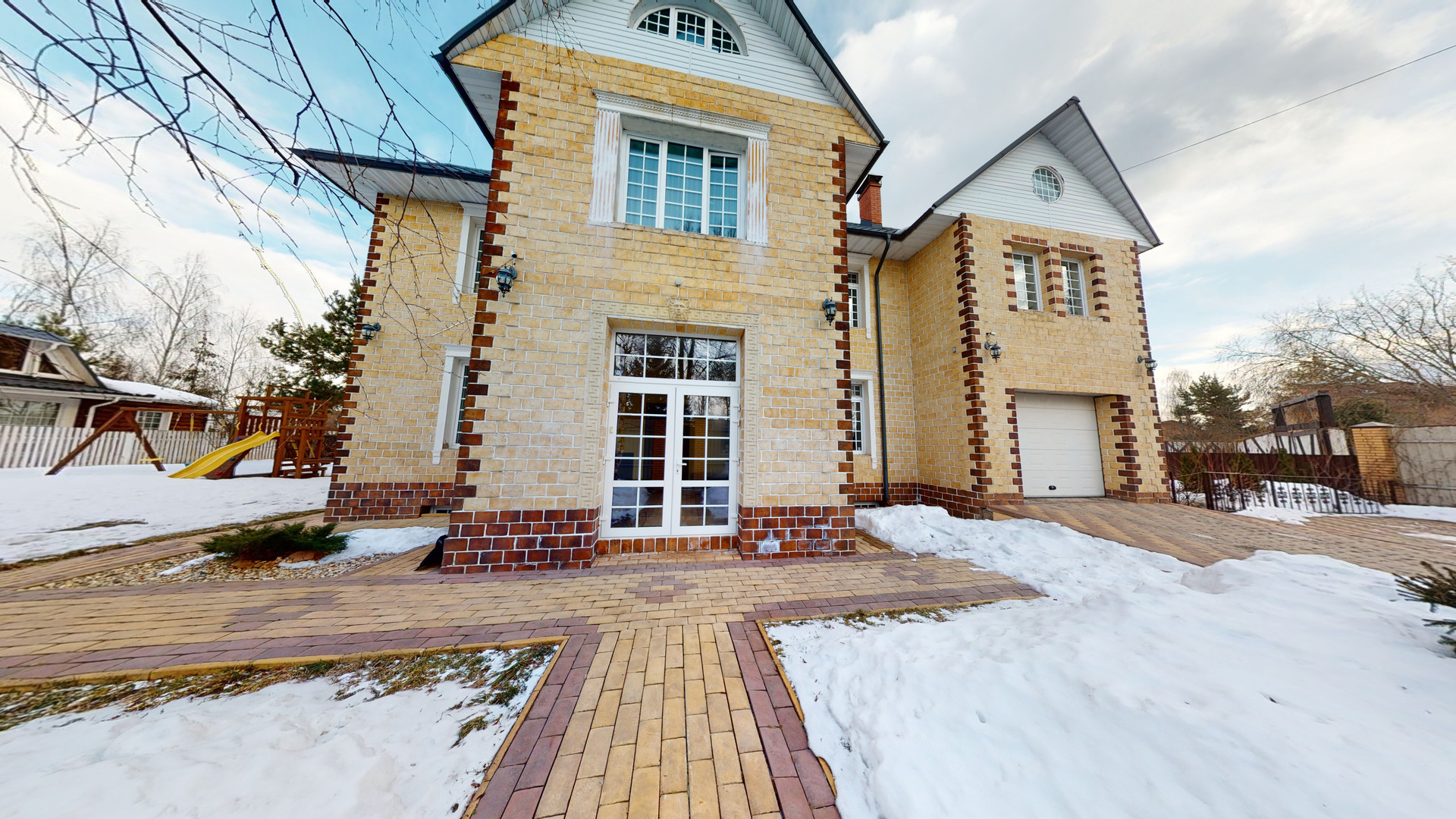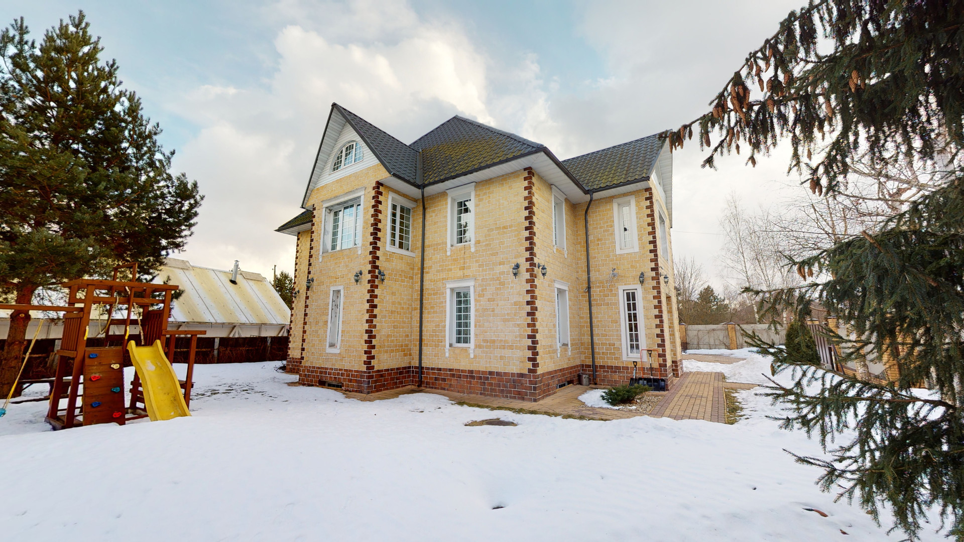 На участке: декоративные и плодовые деревья, детский городок, батут, качели, кровать/беседка, зона барбекю, стол.