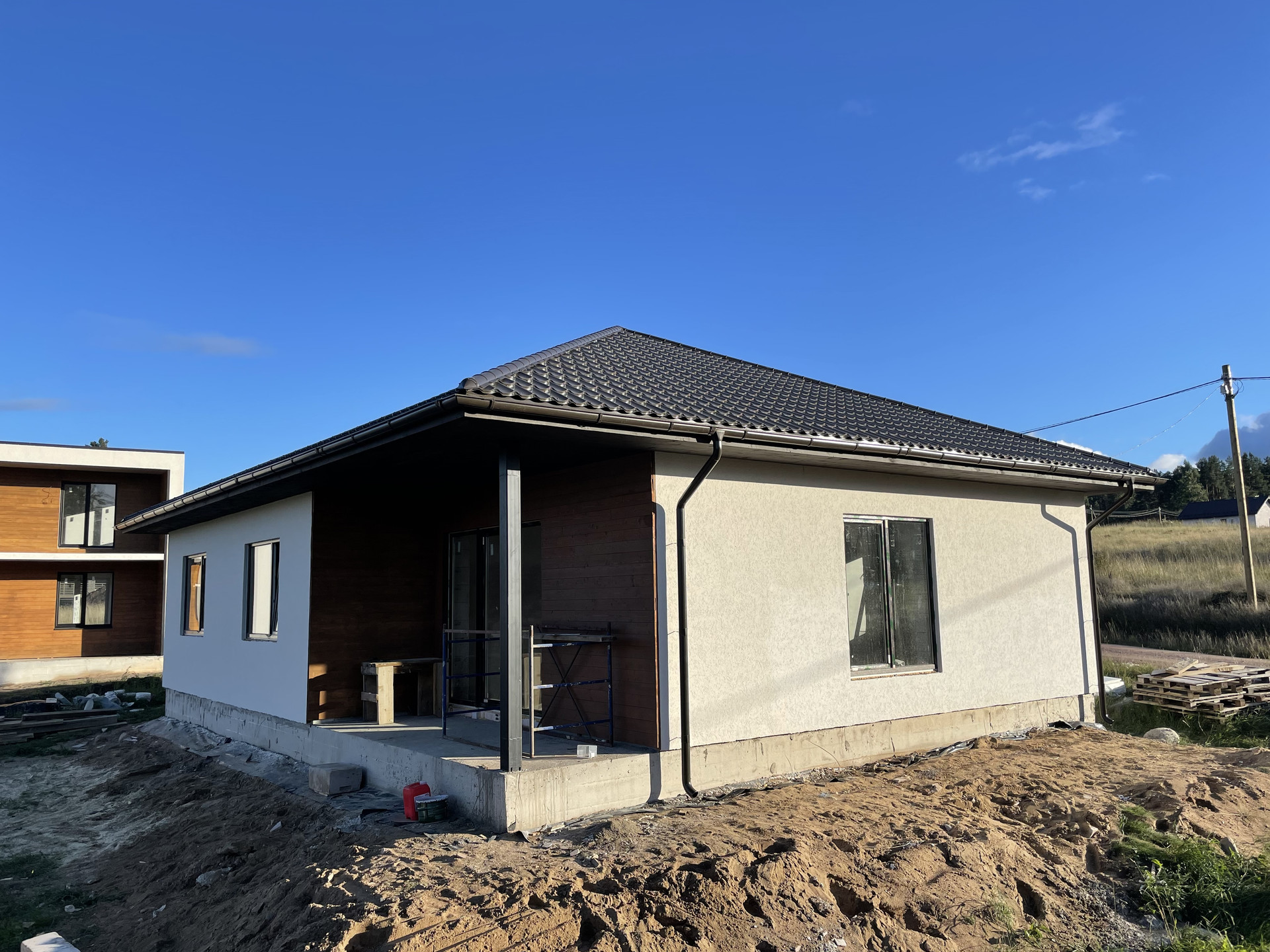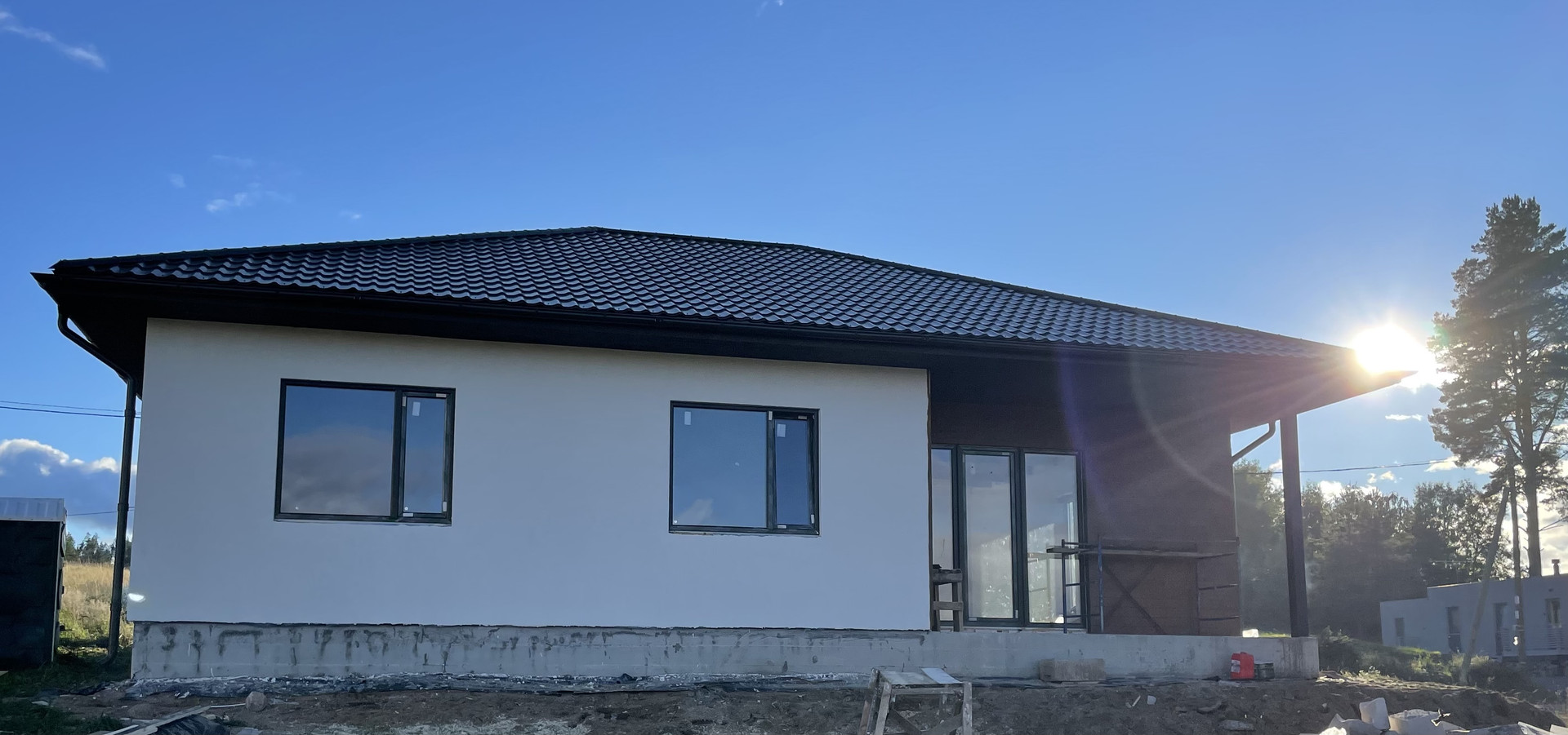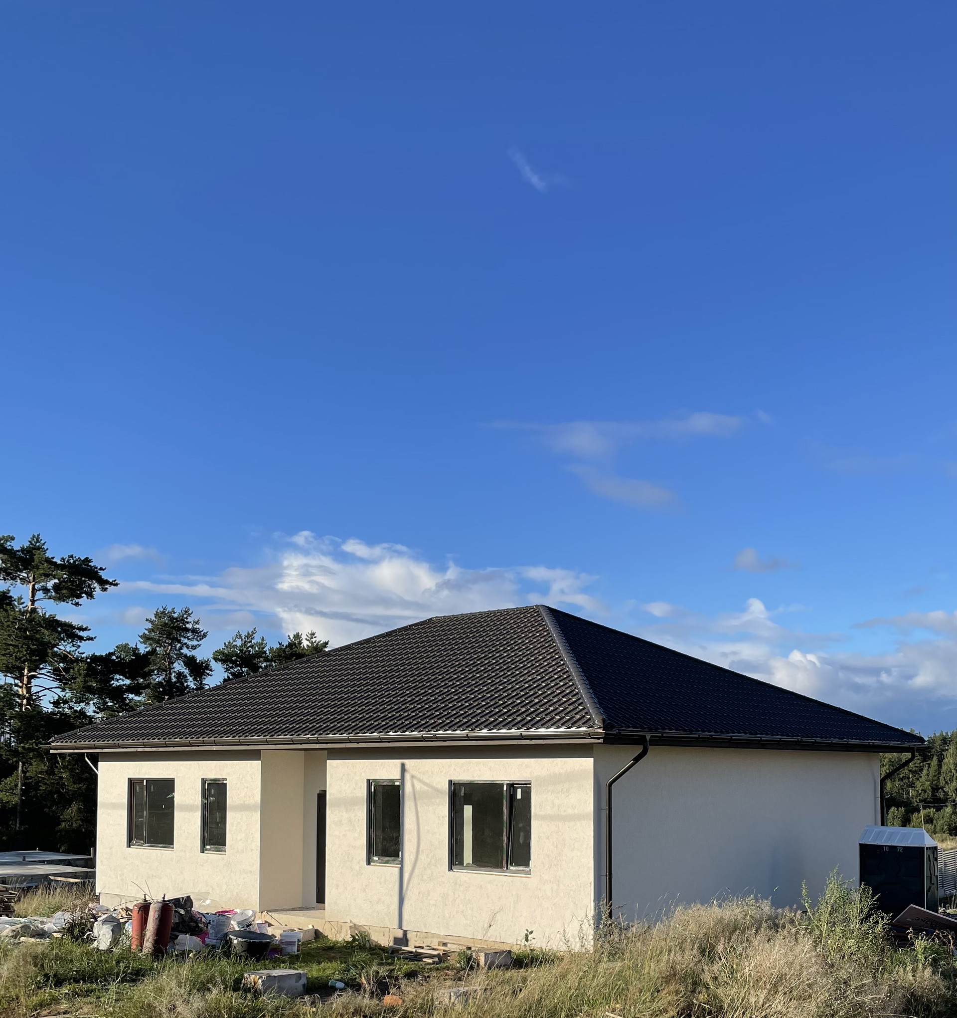 Дом построен на монолитной плите, стены из газобетона. Панорамный вид на сосны. Сухой участок в 9 соток.