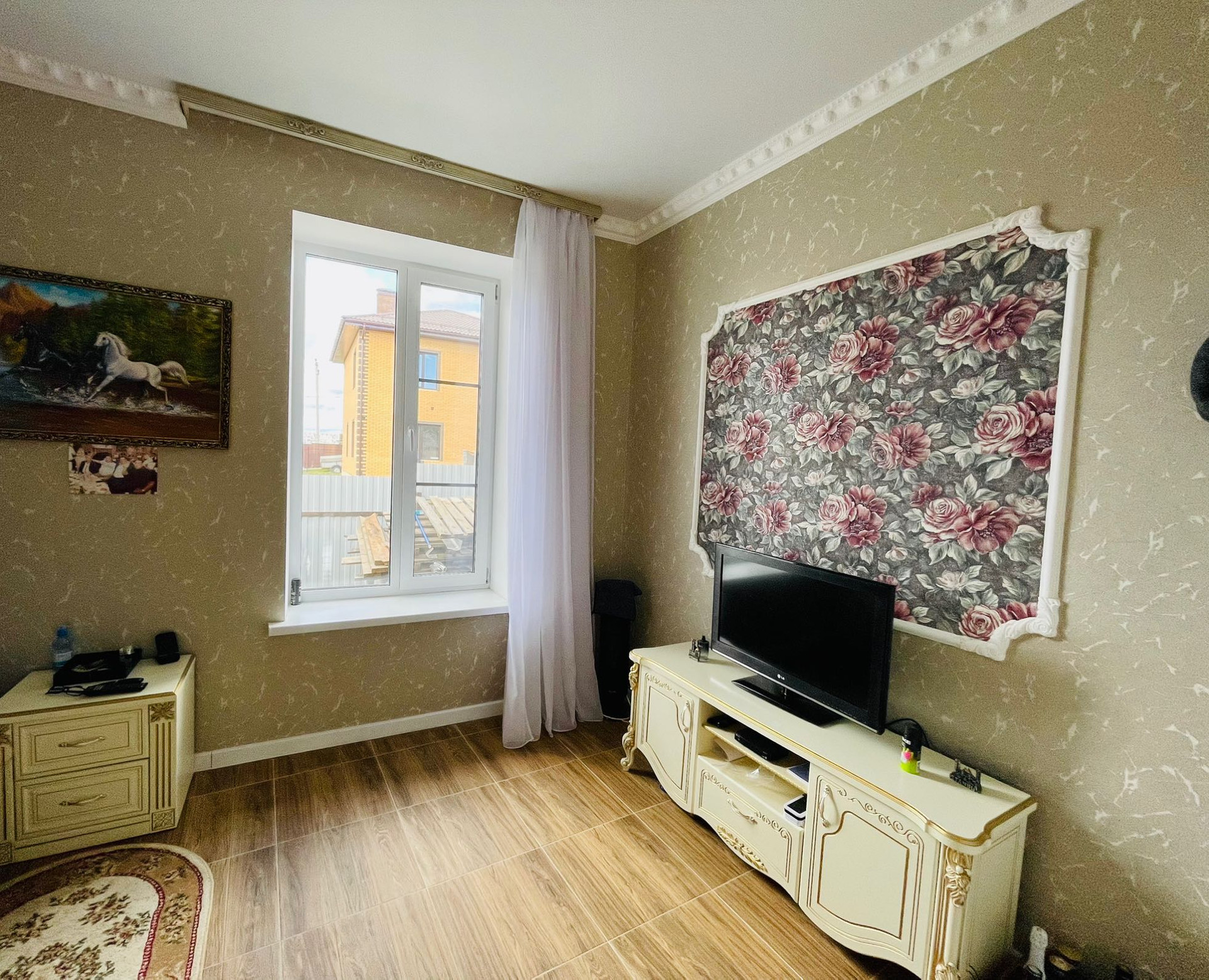 Дом находится в стадии строительства(осталась внешняя отделка и 2 этаж): на данный момент сделана стяжка, штукатурка, шпатлёвка, заведено электричество и вода(газ по границе, в конце марта-начале апреля заведут в дом), сделана разводка тепла по дому, отделан 1-й этаж-полностью пригоден для проживания (произведена разводка электричества, окрашены стены, установлены двери, отделан санузел, уложена плитка).