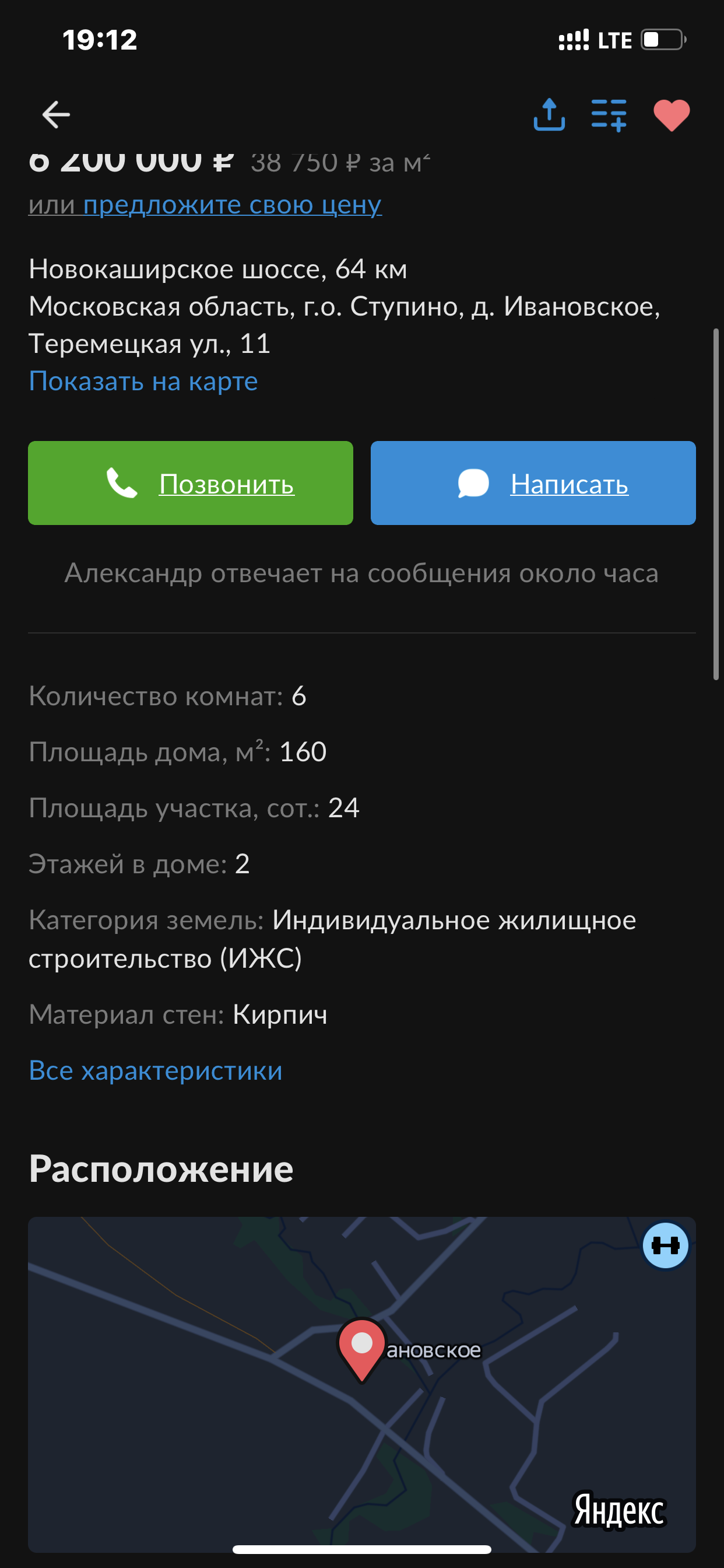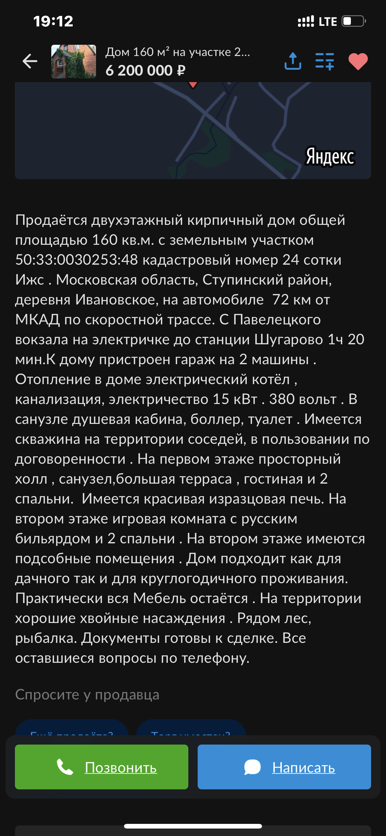 70 км от МКАД по Каширскому шоссе.  Московская область, городской округ Ступино, деревня Ивановское. Продаётся двухэтажный кирпичный дом построенный на ленточном фундаменте. К дому пристроен гараж на 2 машины . Отопление в доме электрический котёл , канализация септик, электричество 15 кВт . 380 вольт, водоснабжение зимнее от скважины. На первом этаже просторный холл , санузел, большая терраса , гостиная и 2 спальни. Имеется красивая изразцовая печь. На втором этаже игровая комната с русским бильярдом и 2 спальни . На втором этаже имеются подсобные помещения . Дом подходит как для дачного так и для круглогодичного проживания. Практически вся Мебель остаётся . На территории хорошие хвойные насаждения . Рядом лес, рыбалка.