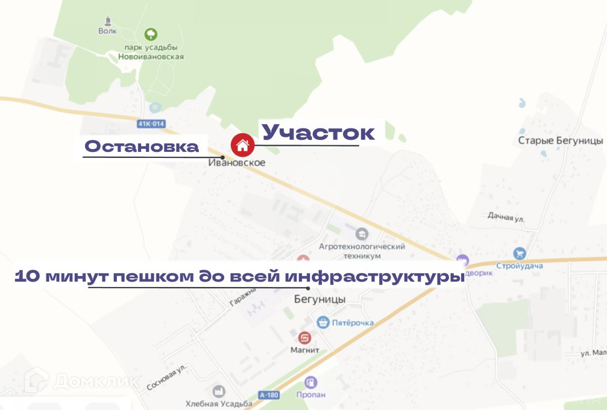 В 10 минутах ходьбы от участка находится центр Бегуницкого сельского поселения, где располагаются супермаркет, магазины, аптека, детский сад, школа, больница, пункт выдачи Ozon и Wildberries, а также Бегуницкий Агротехнический техникум, что дает вам возможность полноценно проживать загородом и иметь все блага цивилизации, которые есть в крупных городах.