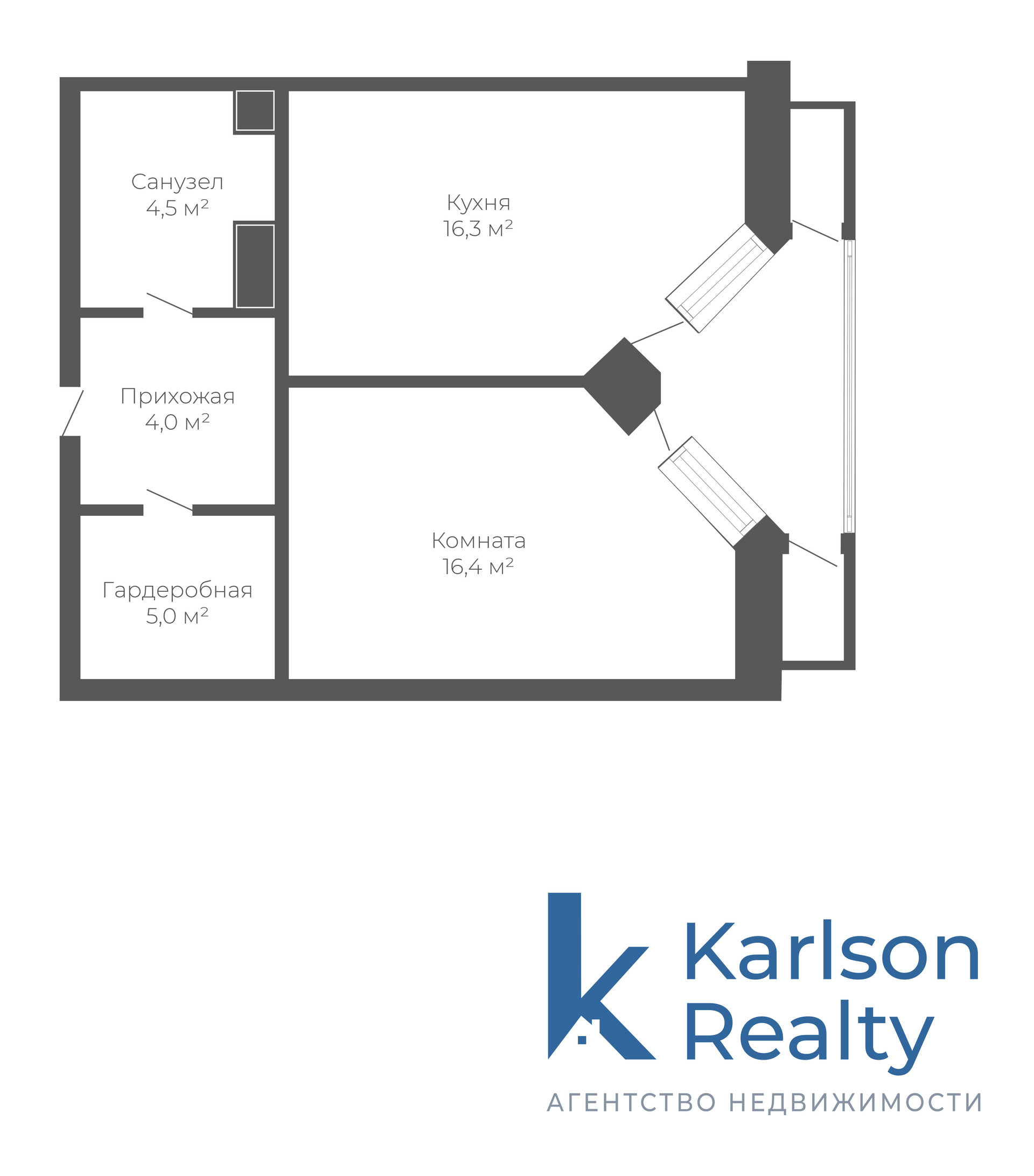 Планировка: прихожая 4 м2, гардеробная 5 м2, кухня-гостиная 16,3 м2, комната 16,4 м2, совмещённый санузел 4.5 м2, лоджия 5 м2, 2 французских балкона.