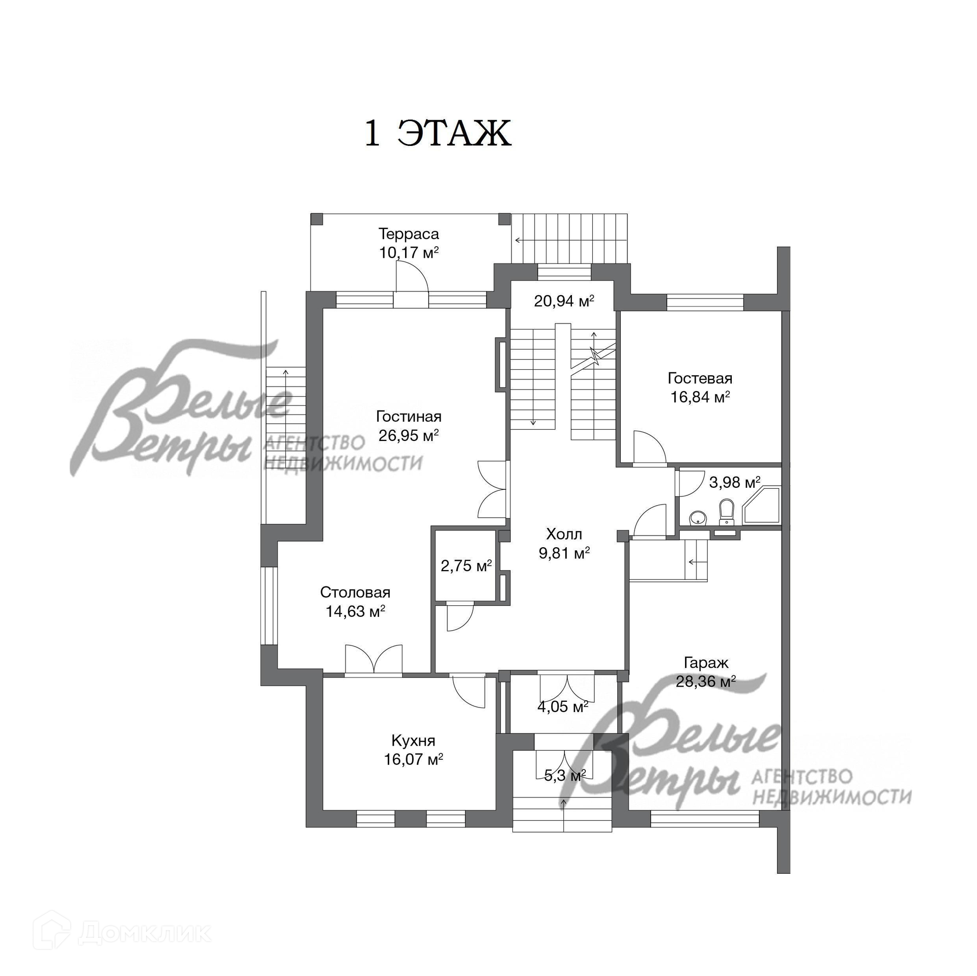 1-ый этаж: крыльцо 5.3 кв.м, тамбур 4 кв.м, холл 10 кв.м с гардеробной 3 кв.м, гостиная 27 кв.м с выходом на террасу 10 кв.м, столовая 15 кв.м, кухня 16 кв.м, санузел 4 кв.м, спальня 17 кв.м, гараж 28 кв.м.