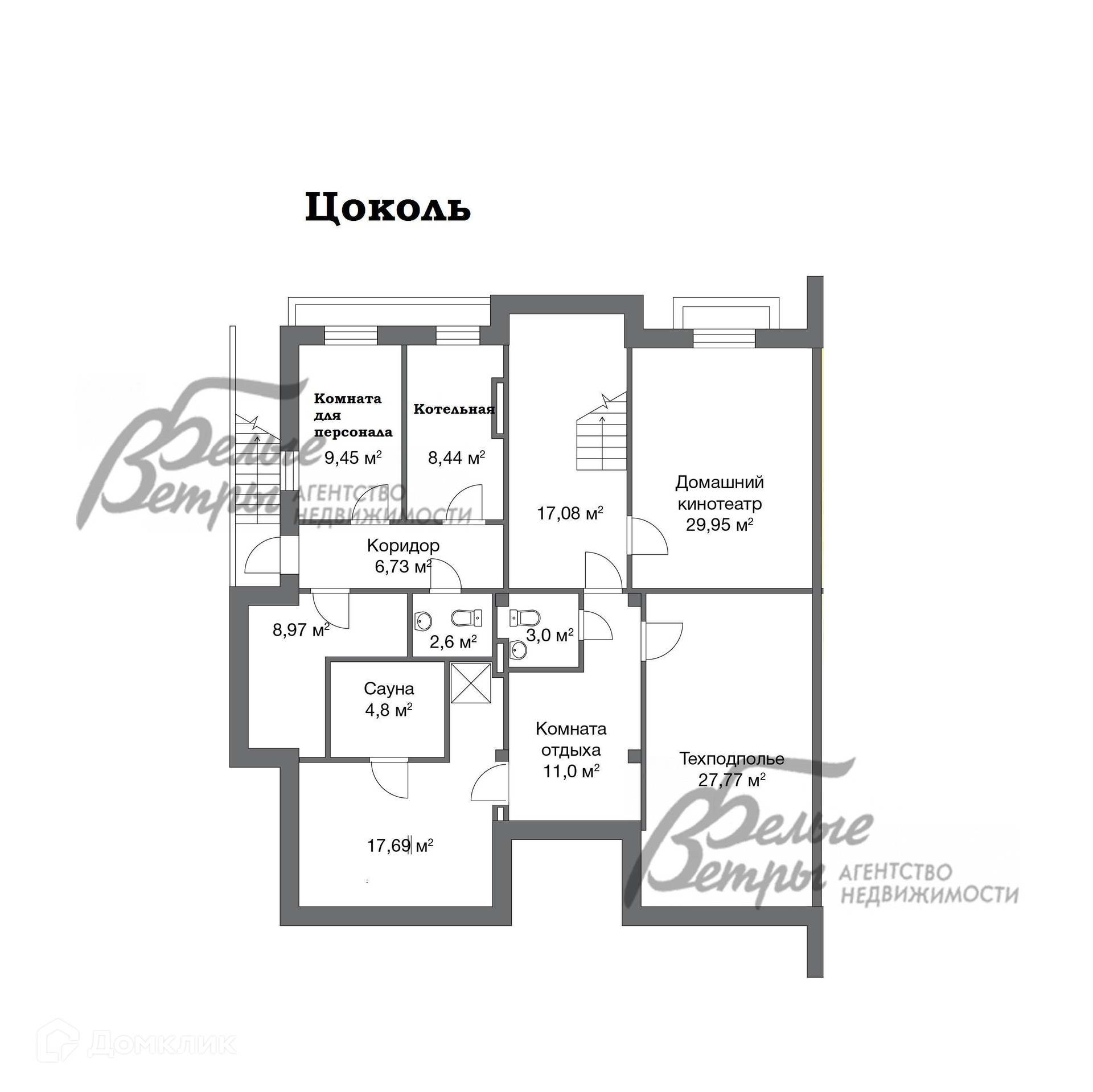 Цокольный этаж: холл 17 кв.м, домашний кинотеатр 30 кв.м, Спа зона (сауна 5кв.м, комната отдыха 11 кв.м, помещение при сауне с душевой 18 кв.м, санузел), комната для персонала 9.4 кв.м с отдельным входом с улицы, санузел, котельная 8.5кв.м, кладовая 9 кв.м, помещение свободного назначения 28 кв.м..