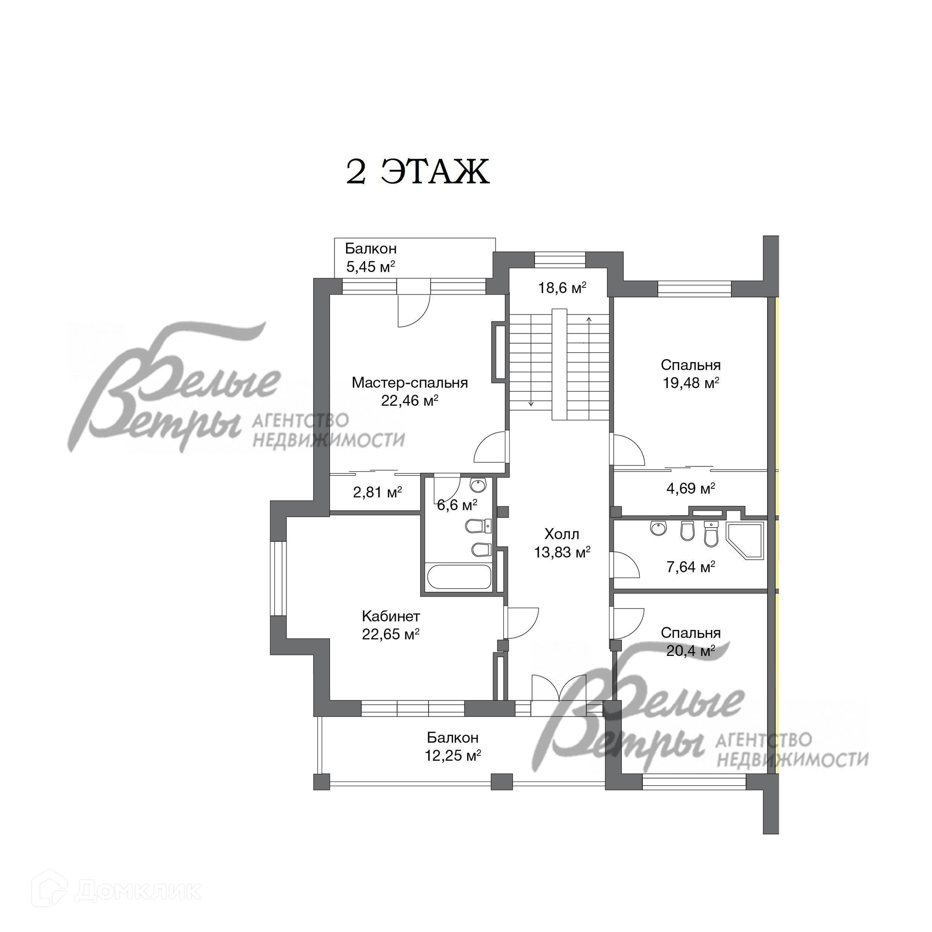 2-ой этаж: холл 14 кв.м с выходом на балкон 12 кв.м, мастер-спальня 22,5 кв.м с гардеробной и ванной комнатой 6.6 кв.м с выходом на балкон 5 кв.м, две спальни по 20 кв.м, кабинет/спальня 22,6 кв.м, санузел 7.6 кв.м.