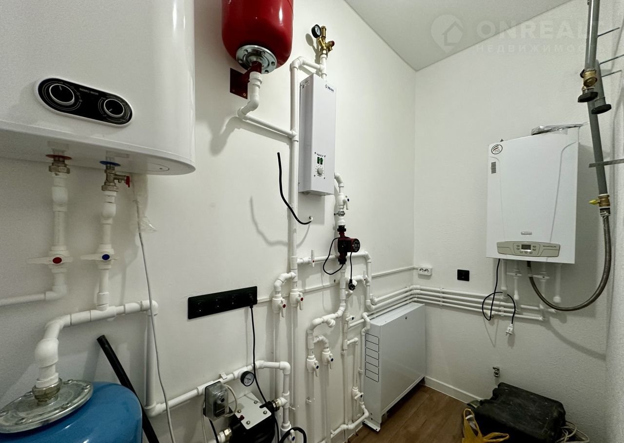 Отопление: водяной теплый пол (в прихожей, коридоре, кухне-гостиной и санузле), дополнительно установлены алюминиевые радиаторы отопления, газовый котел ВАХI ЕСО Fоur 24 F, разводка ГВС и ХВС по дому, электрический водонагреватель.