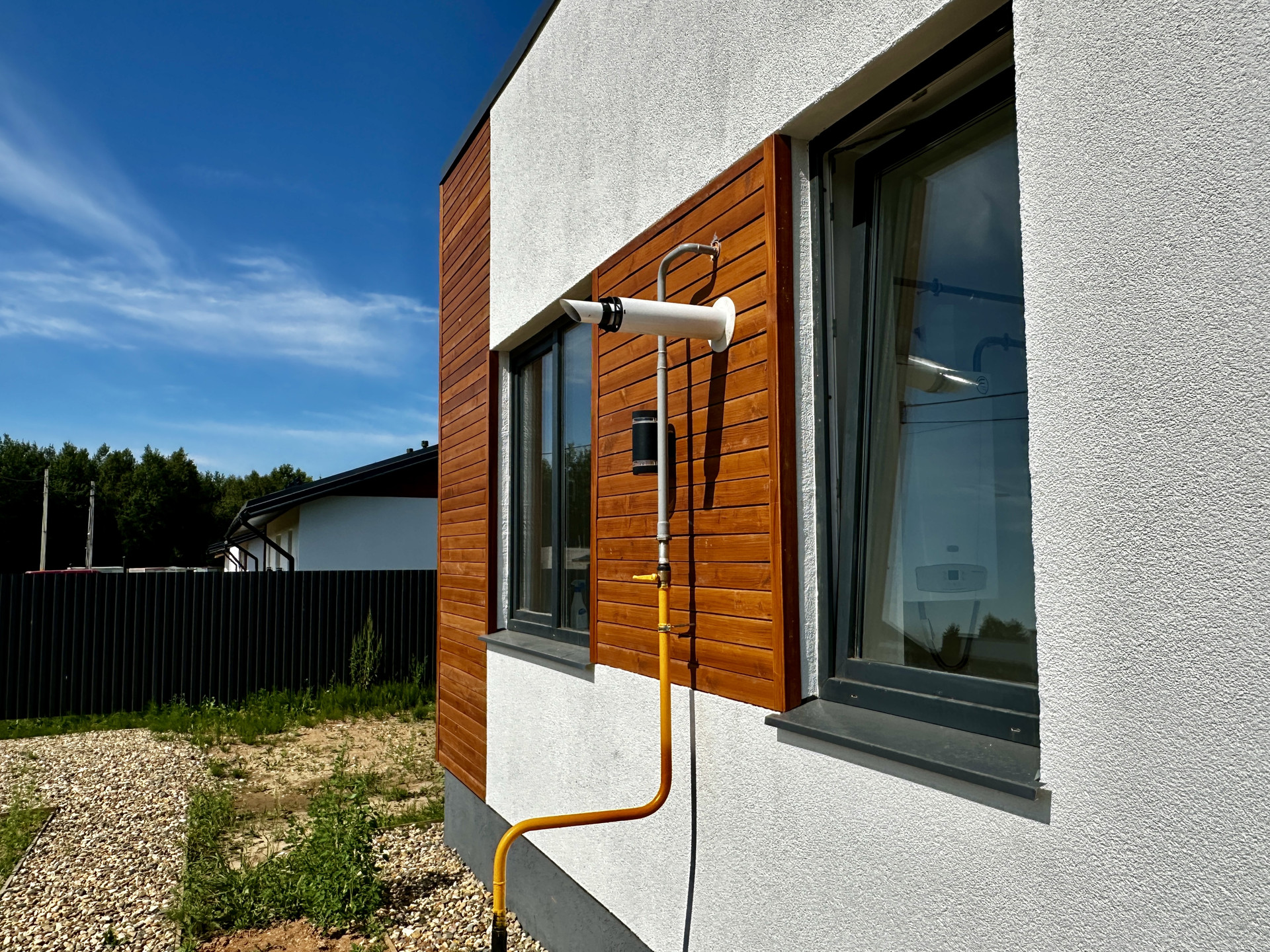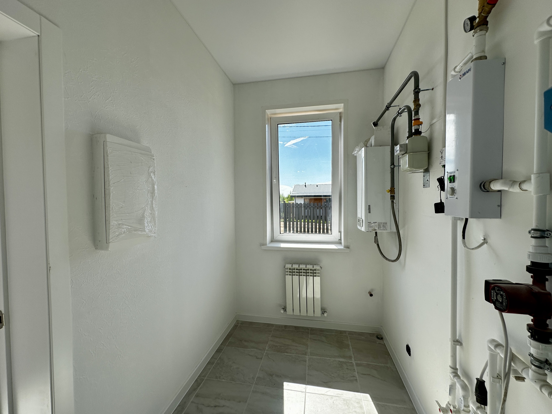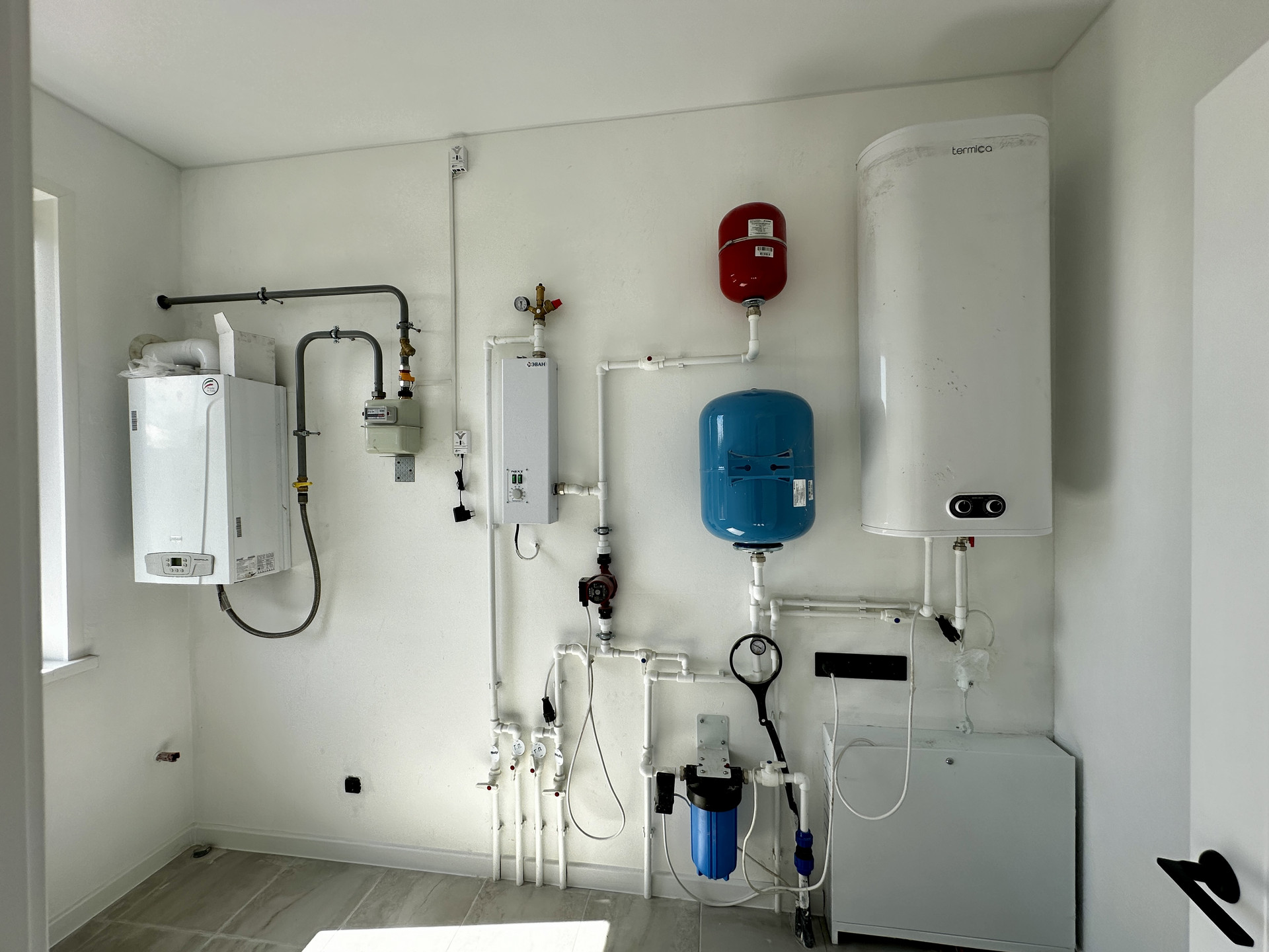 Отопление: водяной теплый пол (в прихожей, коридоре, кухне-гостиной и санузле), дополнительно установлены алюминиевые радиаторы отопления, газовый котел BAXI ECO Four 24 F, разводка ГВС и ХВС по дому, электрический водонагреватель.