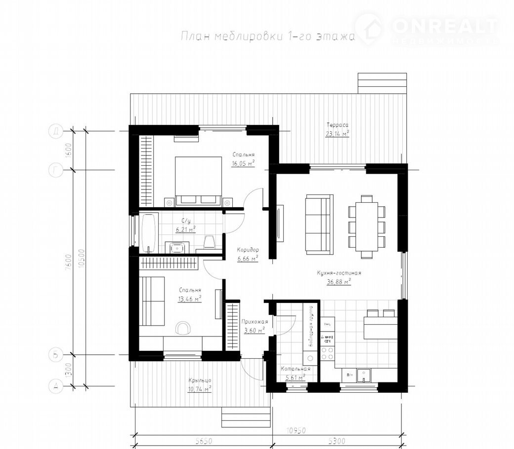 2 спальни, просторная кухня-гостинная 36,88 кв.м. . Участок площадью 7,5 сот