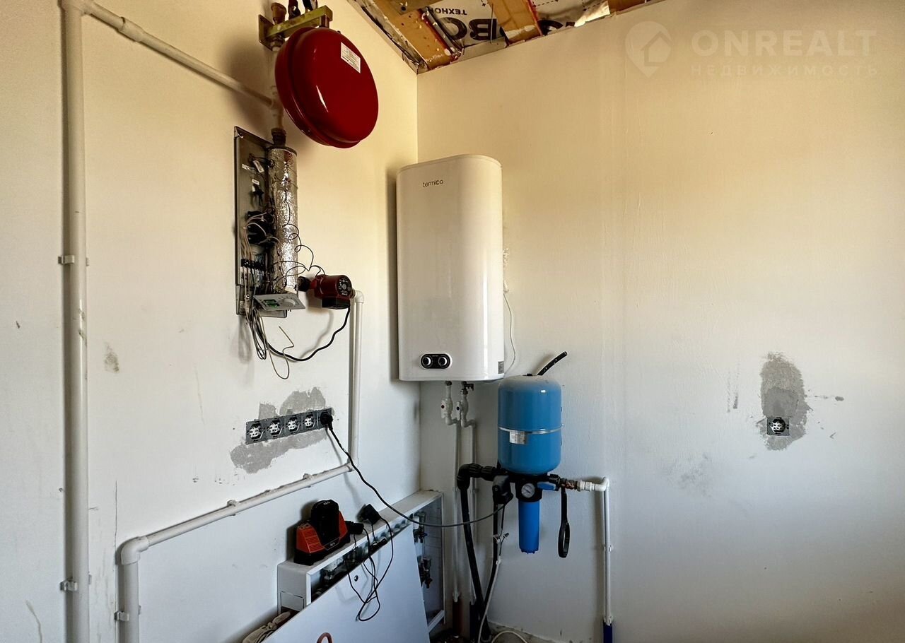 Отопление: водяной теплый пол (в прихожей, коридоре, кухне-гостиной и санузле), дополнительно установлены алюминиевые радиаторы отопления, электрический котел , разводка ГВС и ХВС по дому, электрический водонагреватель.