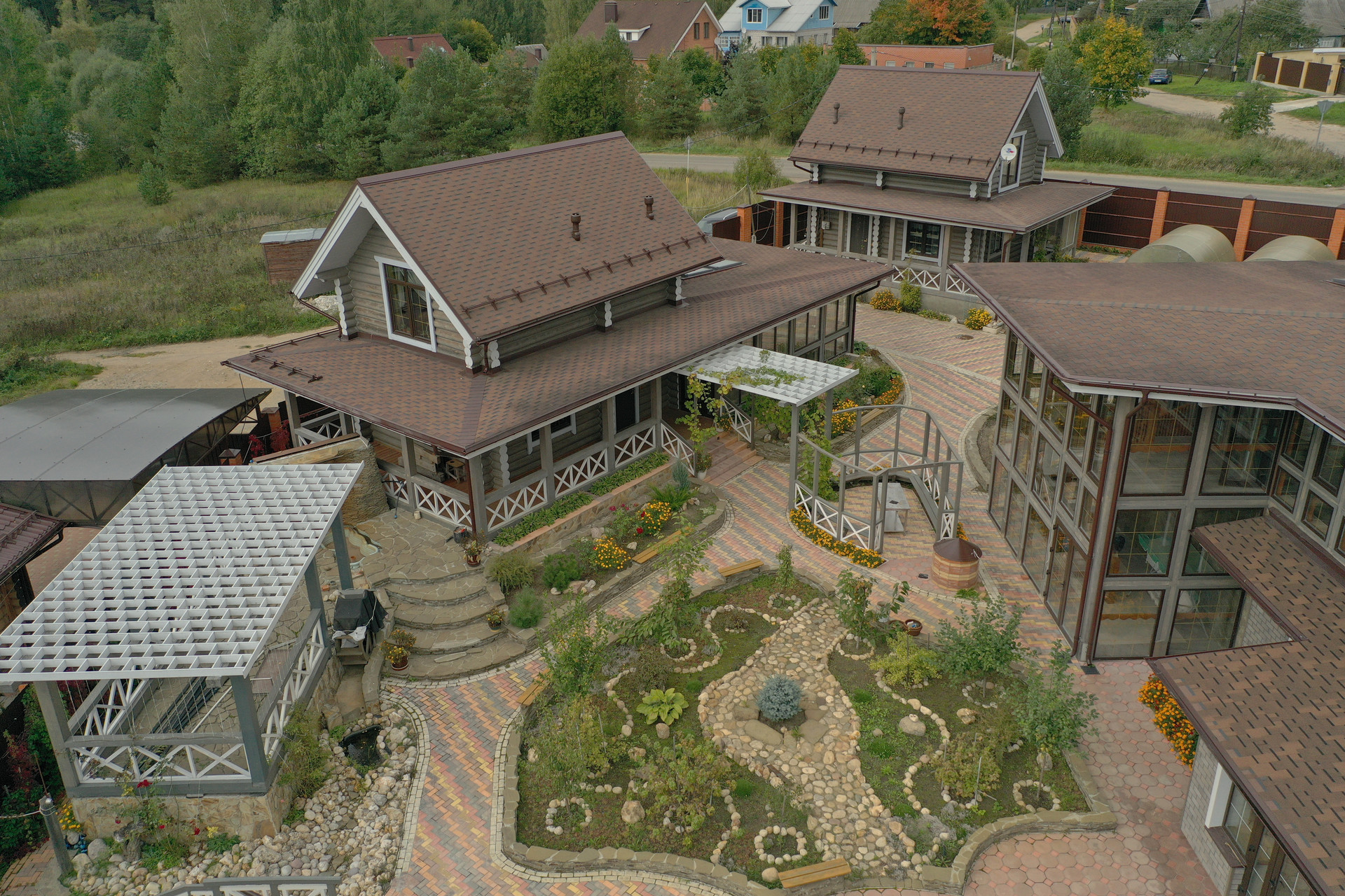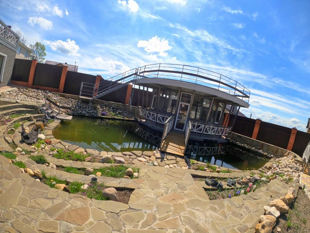 Красивый дворик с прудом и прогулочными дорожками.