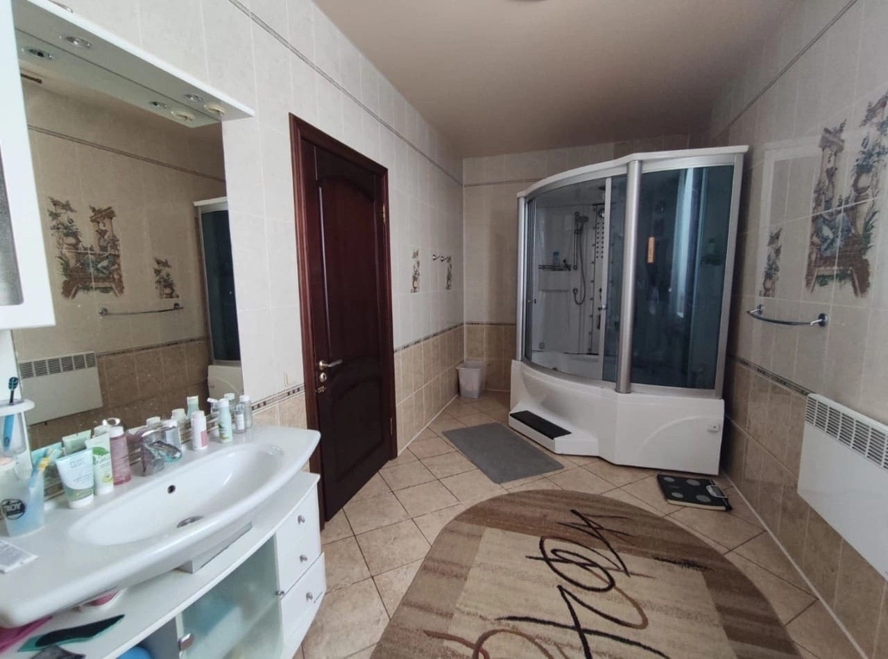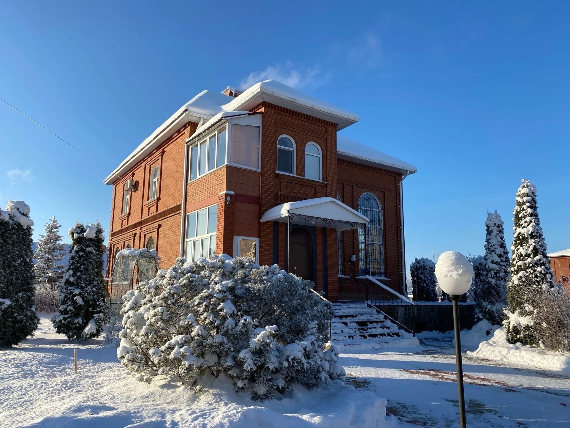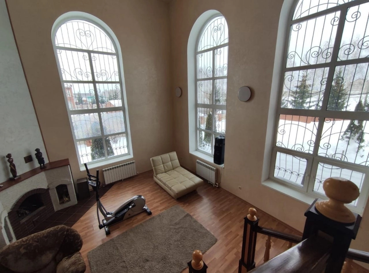 Красный кирпич, площадь 285, 3 кв.м. (первый этаж 127.3 кв.м., второй этаж 94.9 кв.м.), жилая площадь 100 кв.м., два санузла, подвал 63.1 кв.м., высокие потолки, панорамные окна, действующий камин, возле которого так приятно посидеть в кресле читая книгу и попивая кофе. На цокольном этаже: гладильная, прачечная, котельная, холодная комната для продуктов.