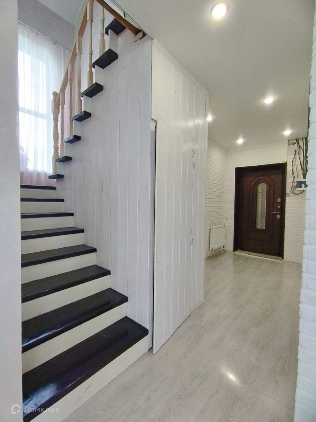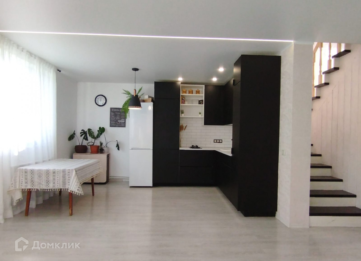 большая светлая кухня - гостиная, кладовка, деревянная пологая лестница.