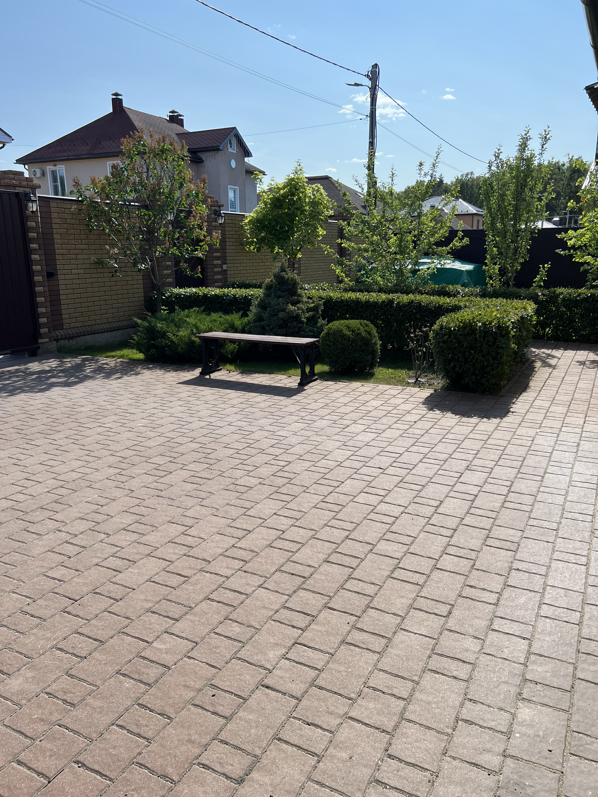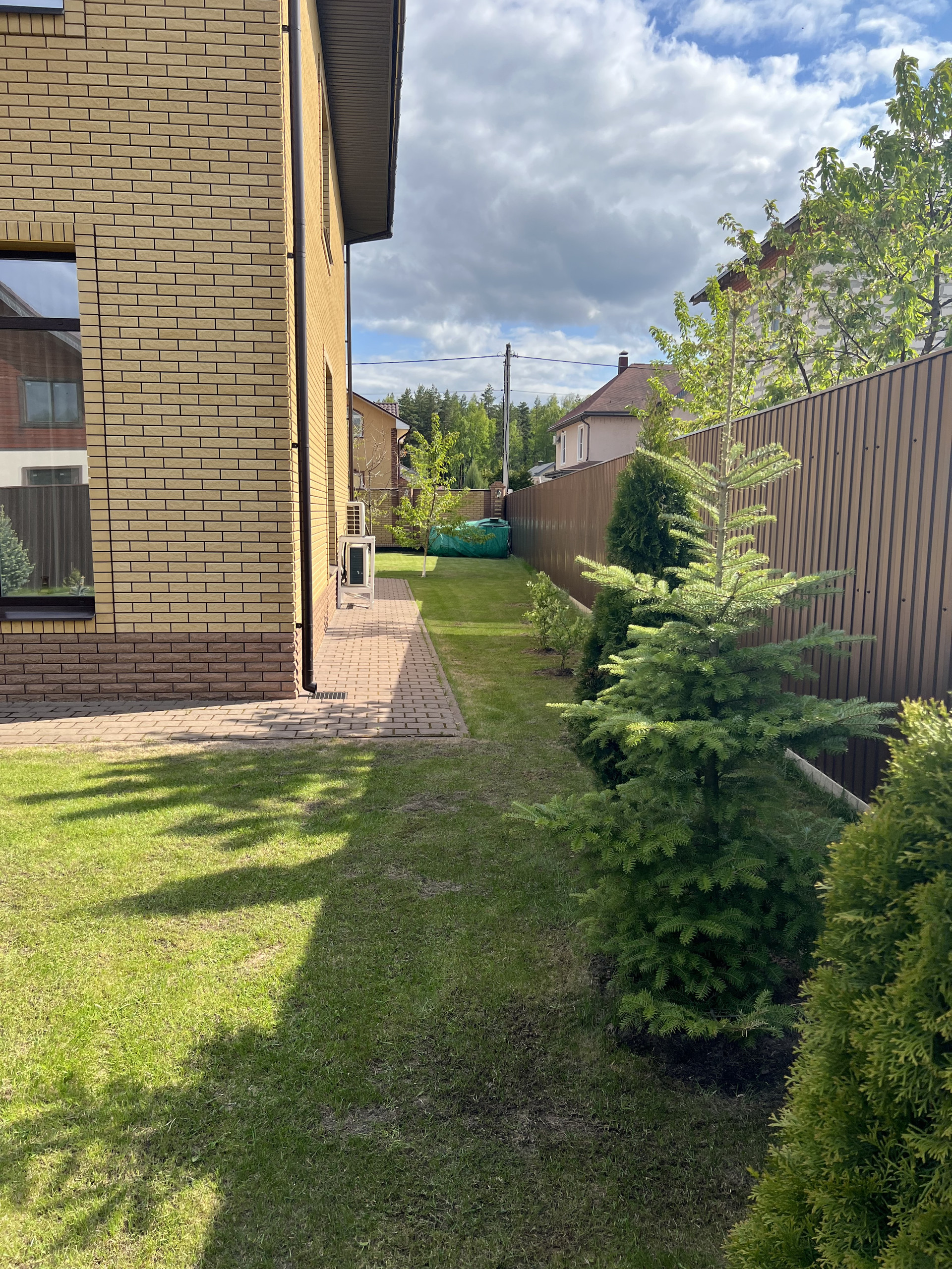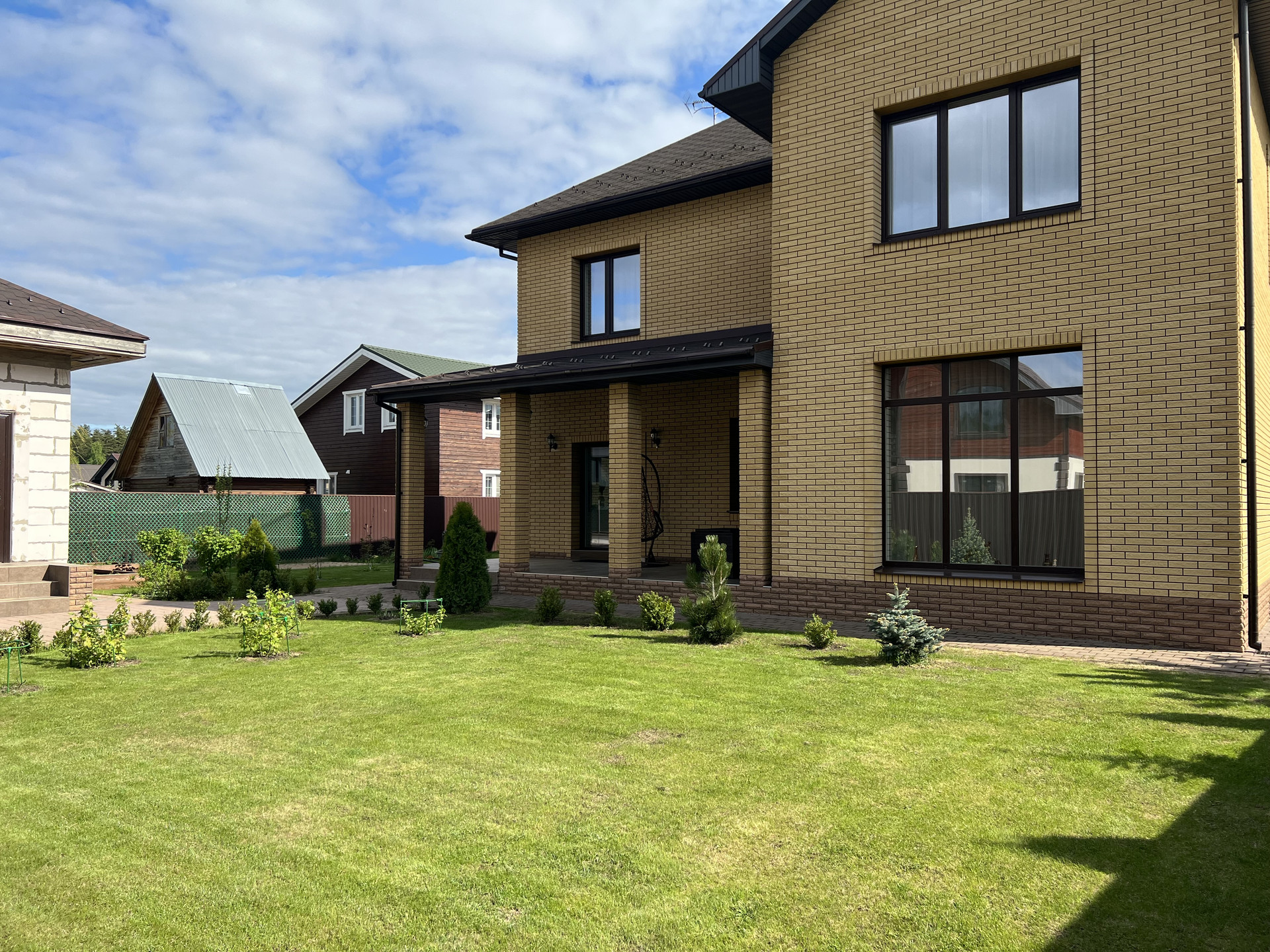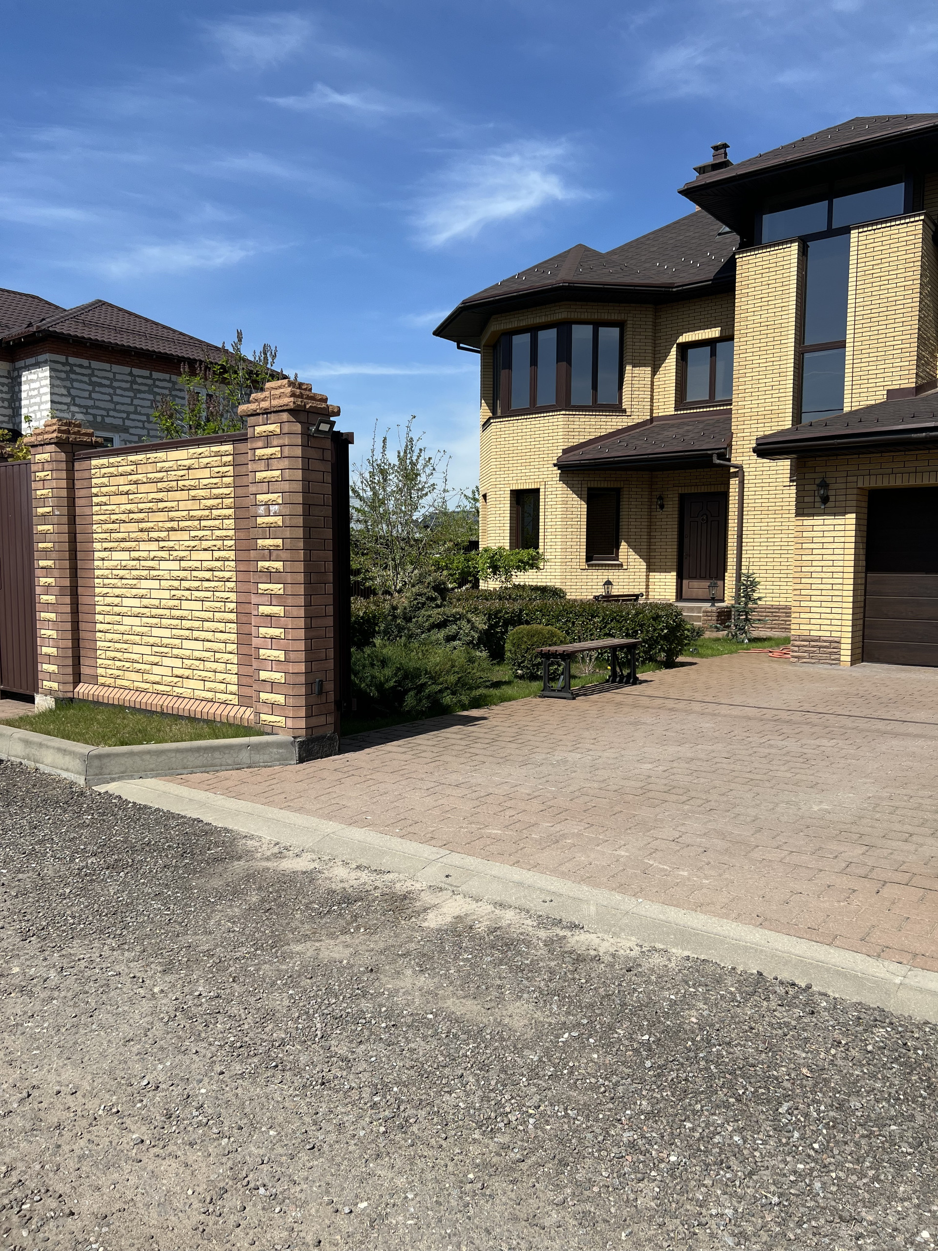 Участок обнесен по периметру забором, лицевая часть забора выполнена из кирпича в едином стиле с домом.  Въездная группа оборудована откатными воротами.