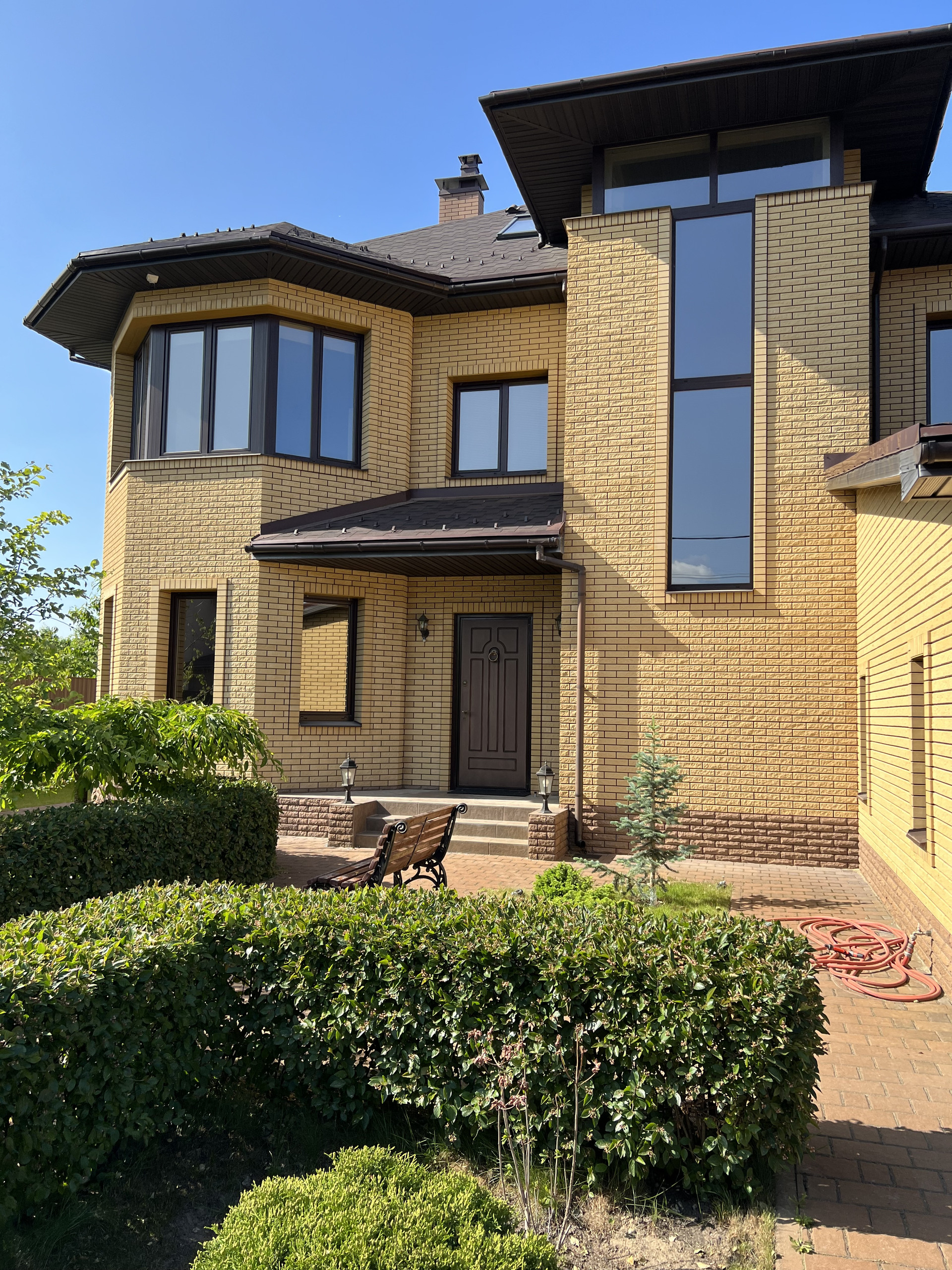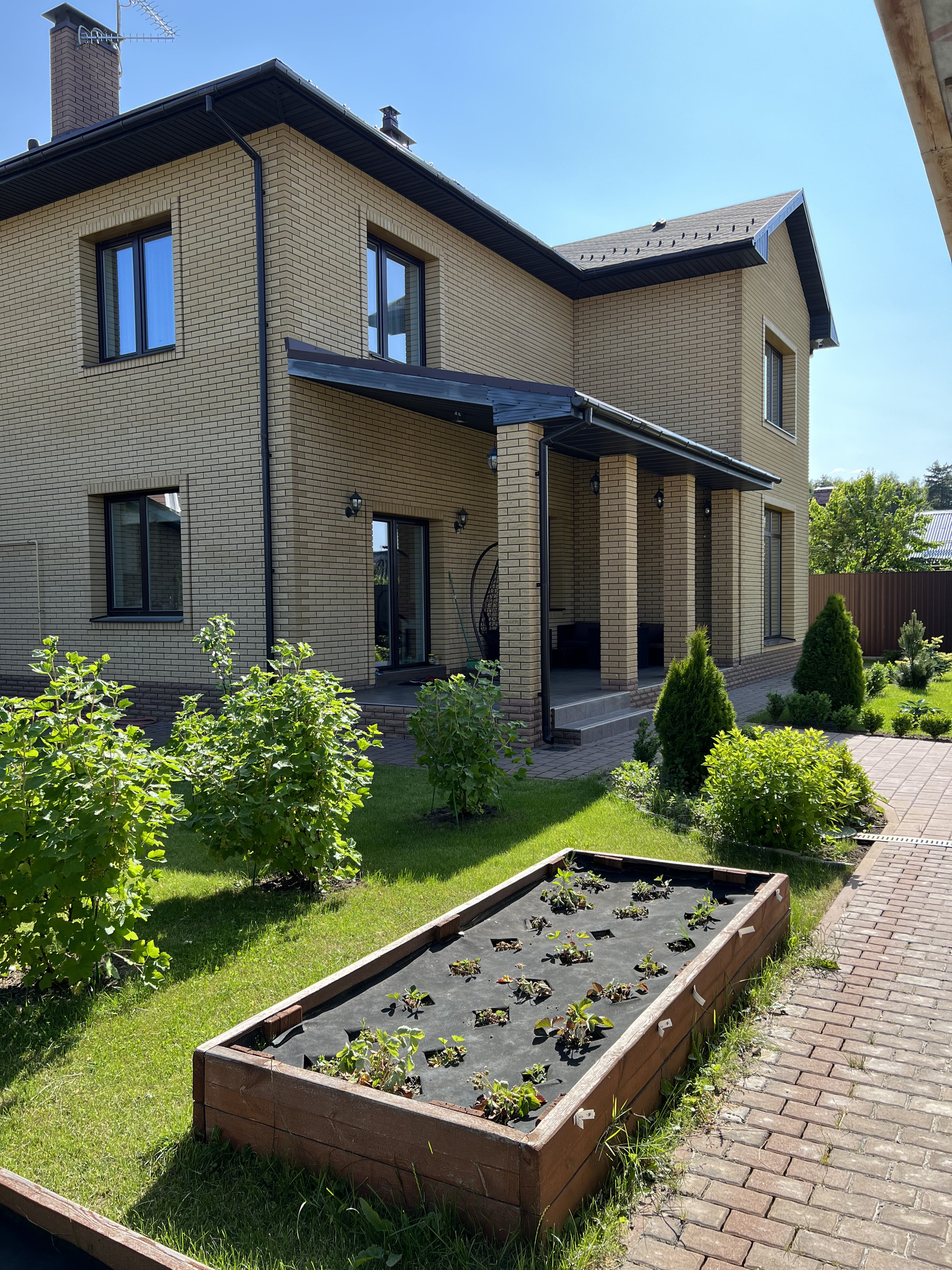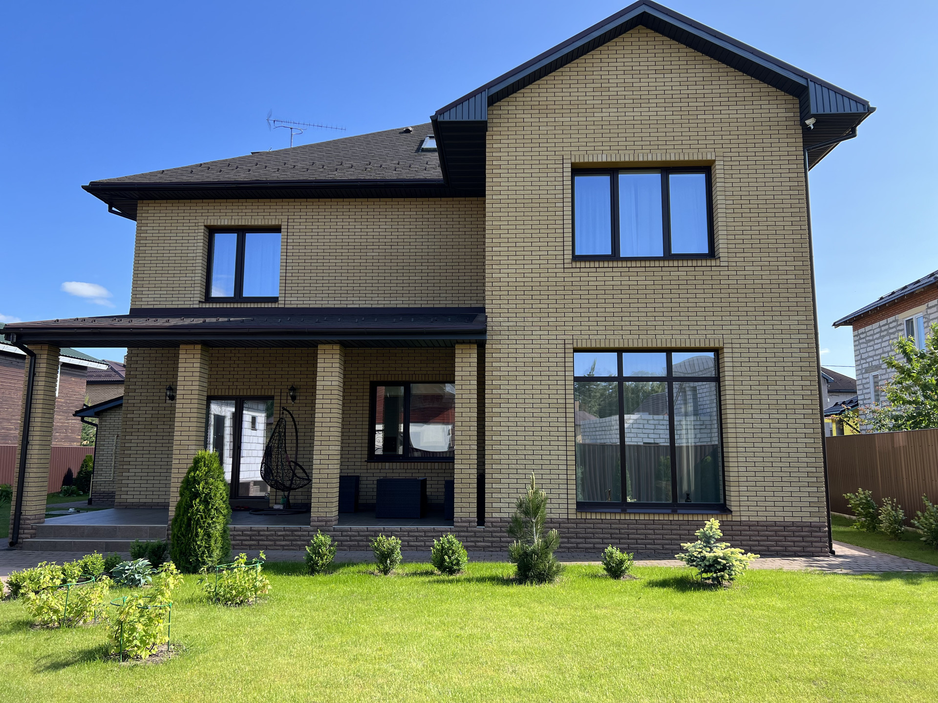 Дом построен в 2017 году из газосиликатного блока толщиной 375мм. и облицован кирпичом иностранного производства. Крыша покрыта мягкой финской кровлей Katepal, что удобно для ее обслуживания. Общая площадь дома составляет 263,9 м2 согласно кадастру, реальная площадь 363,9 м2.