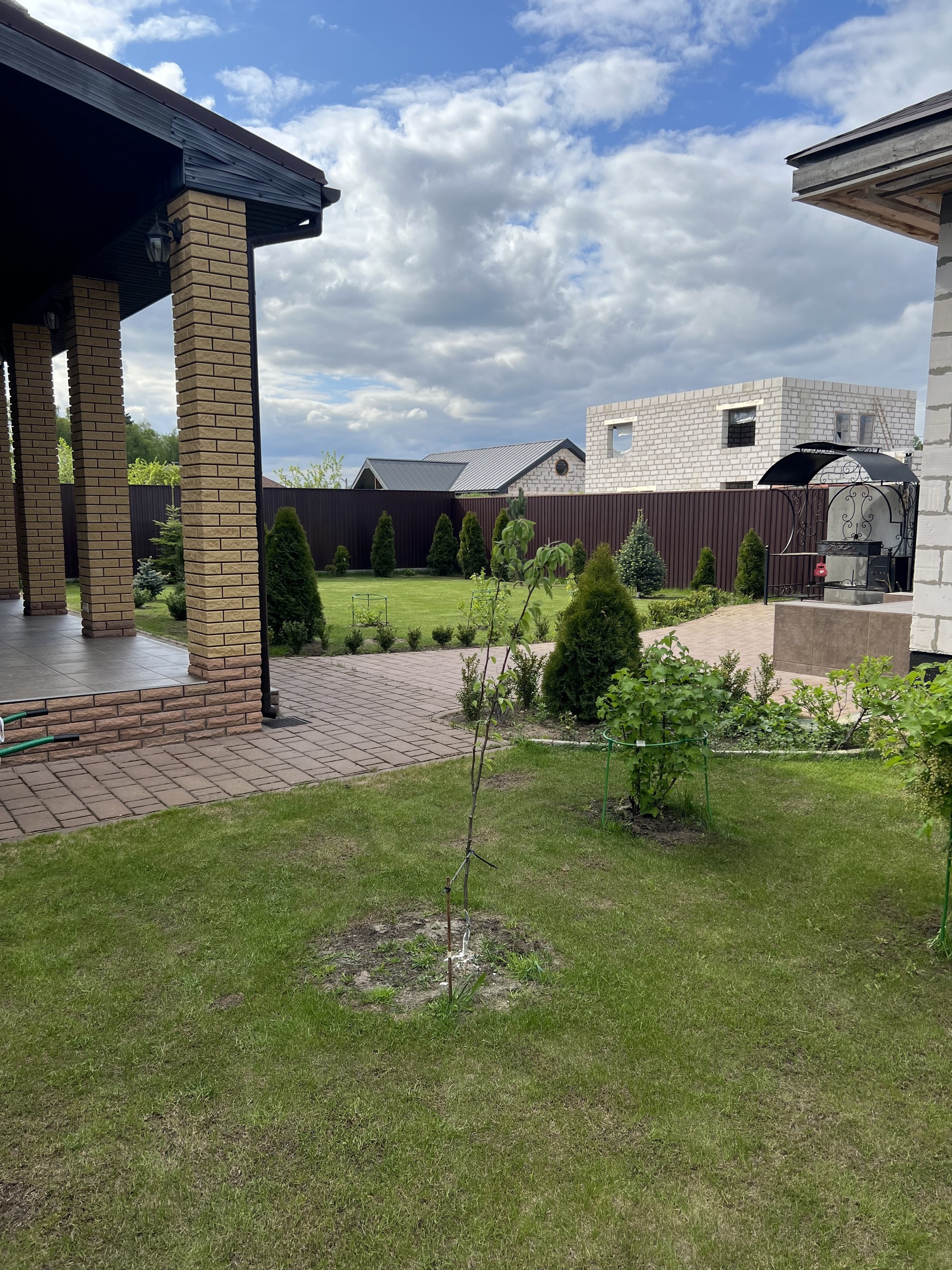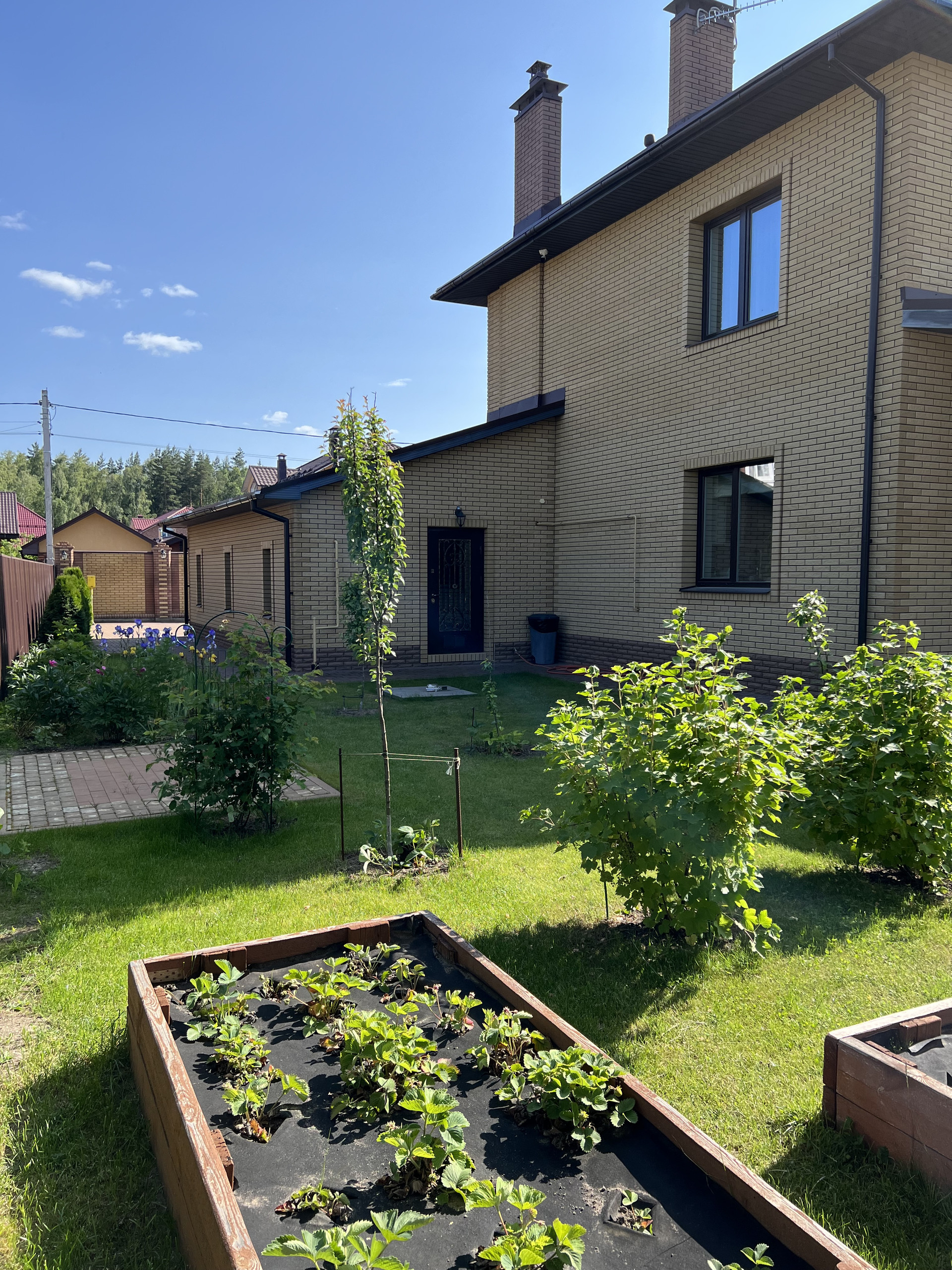 На участке выполнен ландшафтный дизайн (посажены декоративные и плодовые растения).