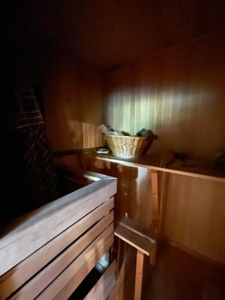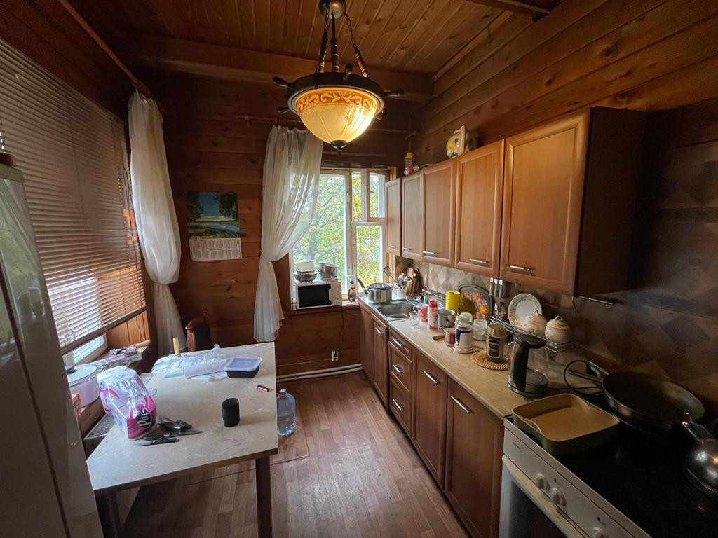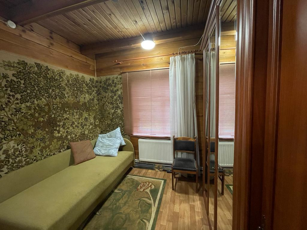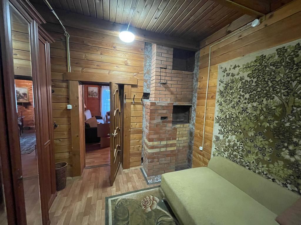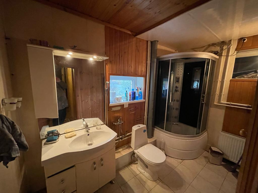 На первом этаже дома 78,8 кв. м расположены прихожая,просторная гостинная, зона кухни ,спальная комната ,ванная комната с выделенной зонной для сауны ,а так же вход в отапливаемый гараж с выходом на улицу, в гараже располагается котельная (газовый котел, бойлер и насосная станция).Все помещение внутри обшито вагонкой с экологичной пропиткой, пол лак. Двери, окна - дерево.