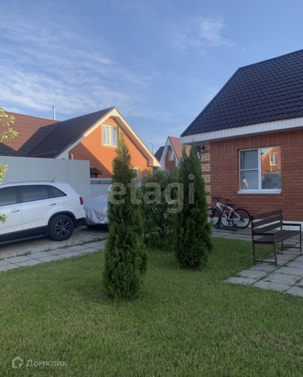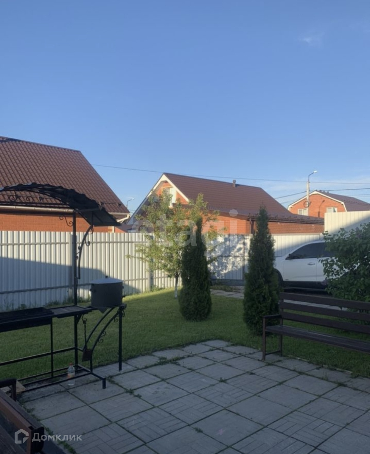 Есть стоянка для машины, беседка, мангальная зона, лавочки, небольшое подсобное помещение.