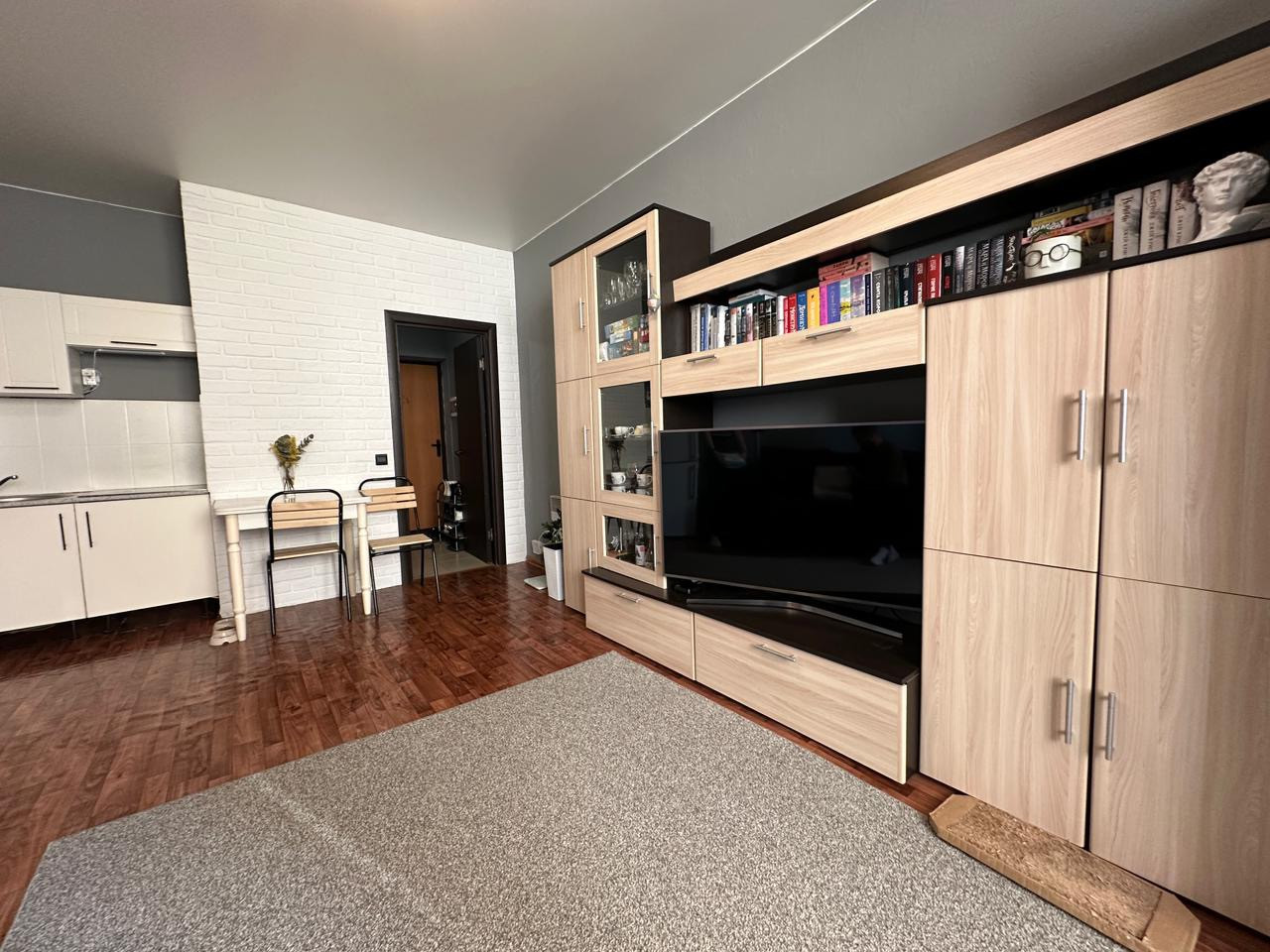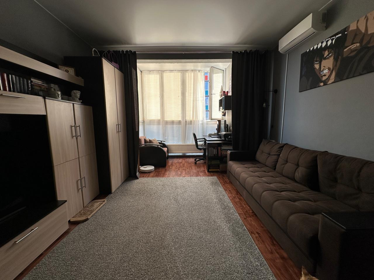 Свежий косметический ремонт. Во всей квартире натяжные потолки. В квартире остается все, кроме телевизора, компьютера, компьютерного стула и робота-пылесоса.