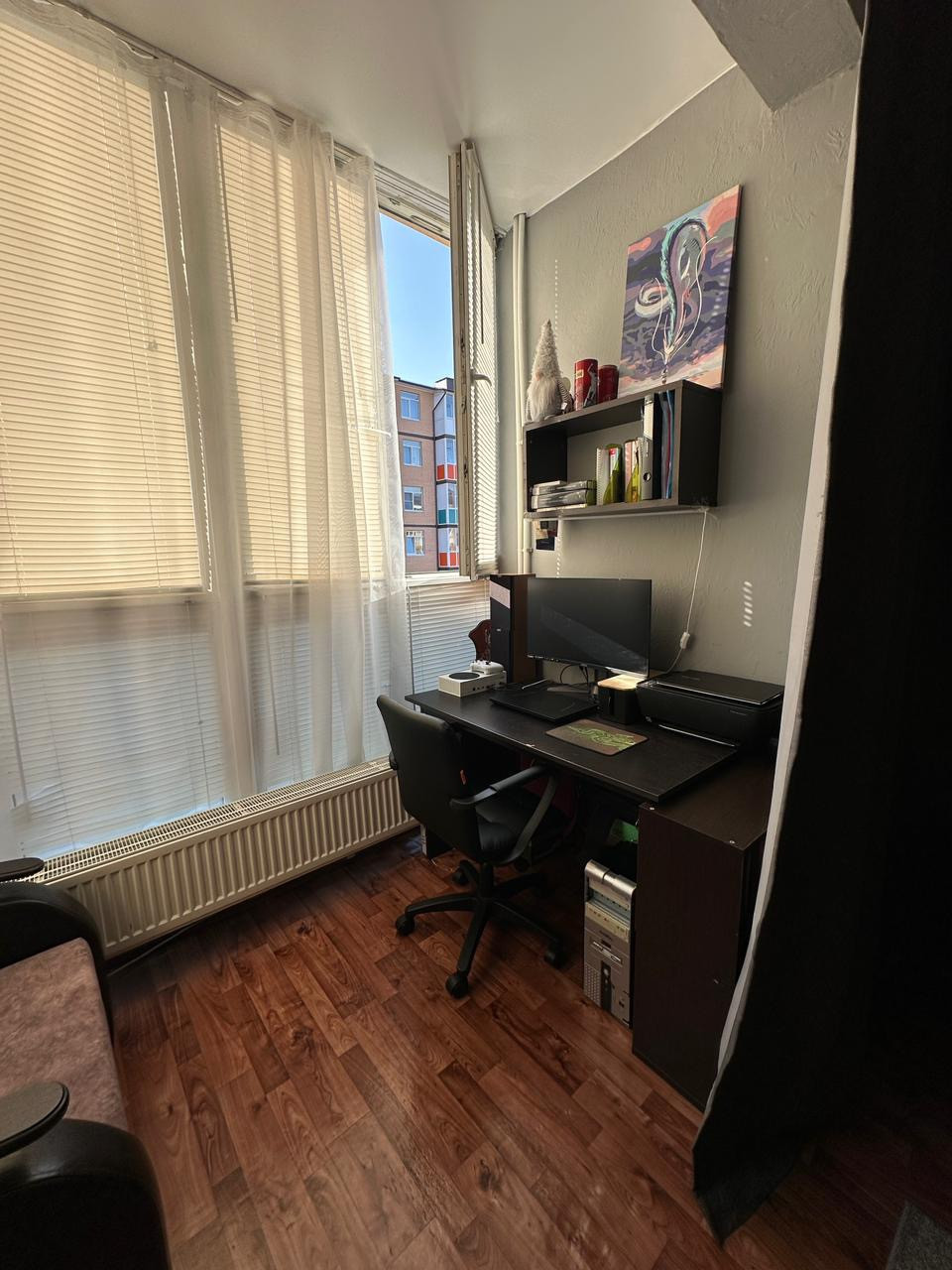 Общая площадь - 33,4 кв.м. Отдельная прихожая, есть зона кухни и балкона. На балконе организована рабочая зона. Санузел совмещенный. Окна панорамные. Есть кондиционер. В коридоре есть кладовое место.
