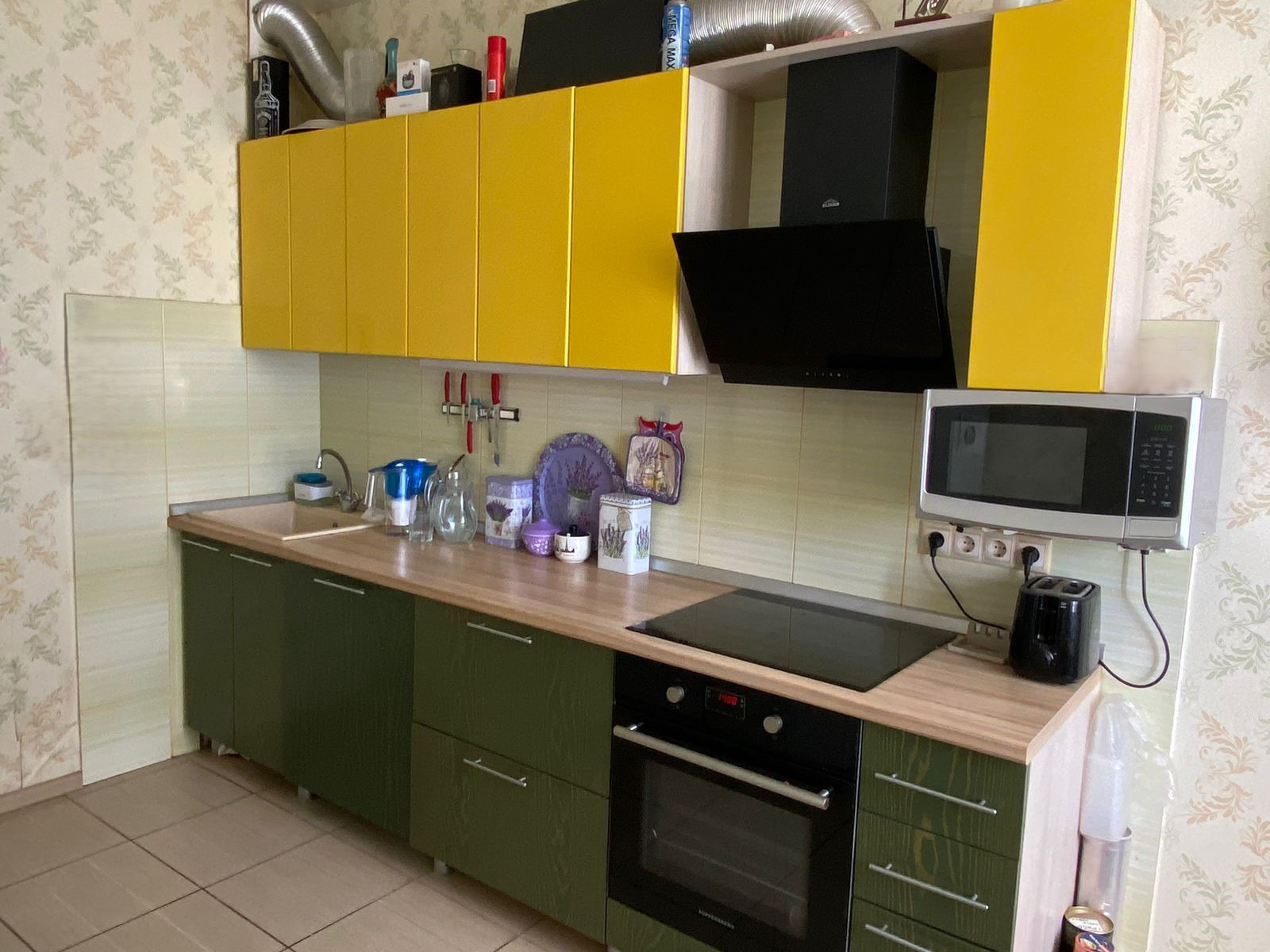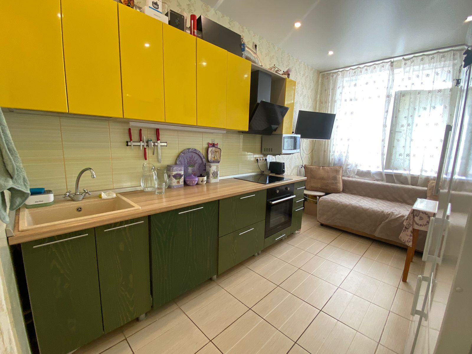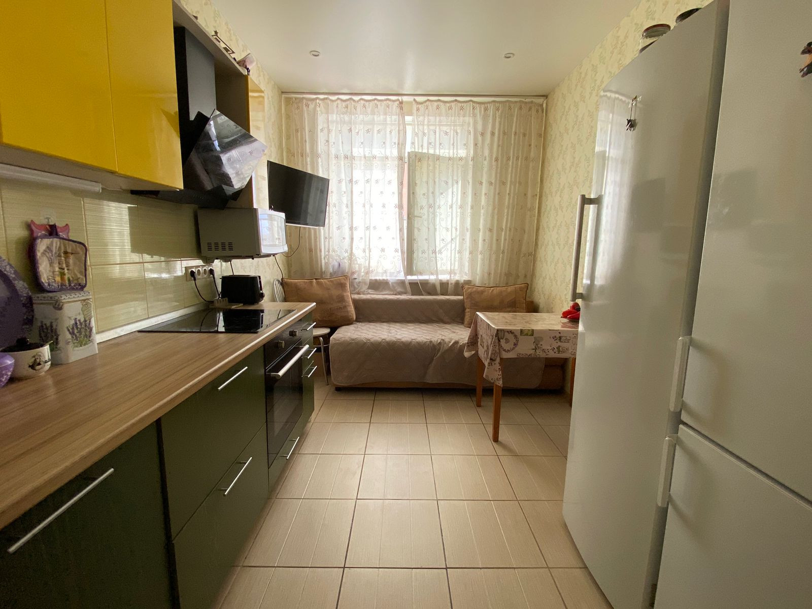 В цену квартиры входит дорогой встроенный кухонный гарнитур с натуральными фасадами, техника (индукционная варочная панель, вытяжка, посудомойка 60 см Bosch).