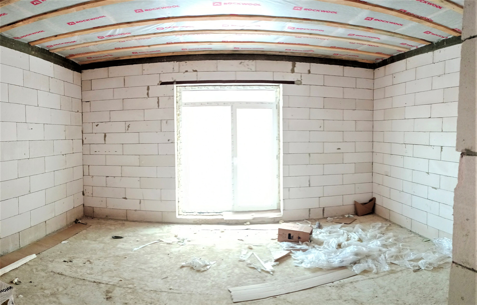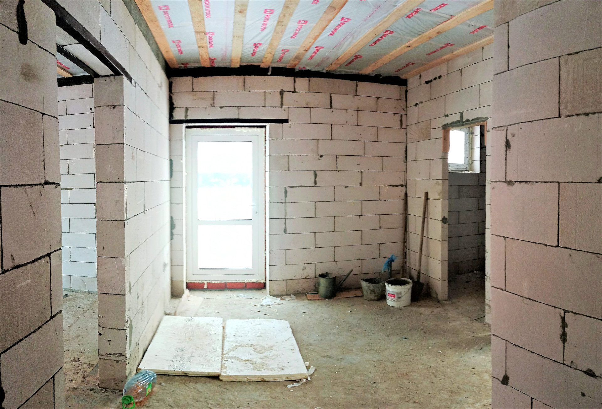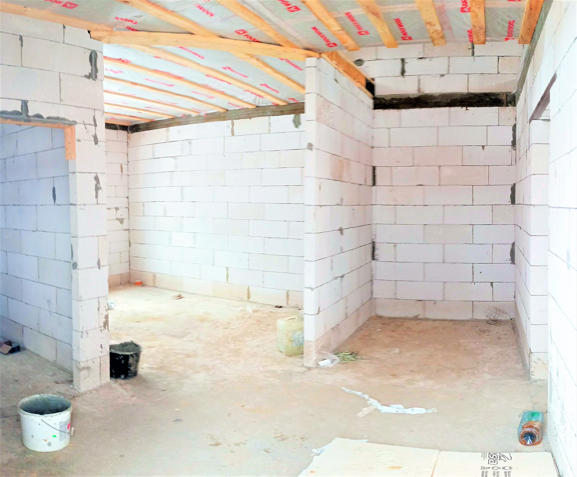 На первом этаже установлены межкомнатные перегородки, под сан. узел, холл, кухня гостиная, одна комната;