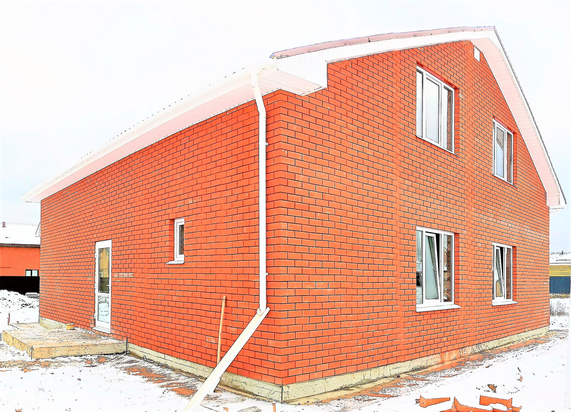 Дом БЧО, фундамент монолитная плита, стены пеноблок обложен облицовочным кирпичом, крыша металлочерепица.