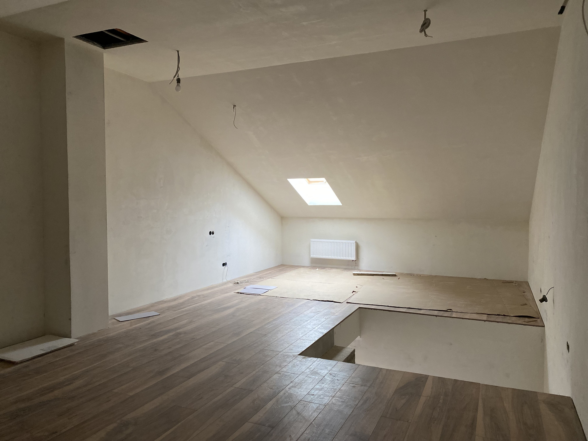 В данной зоне планировалось следующее решение: зона кинотеатра (вся электрика выведена), бильярд. Окно в помещении есть.