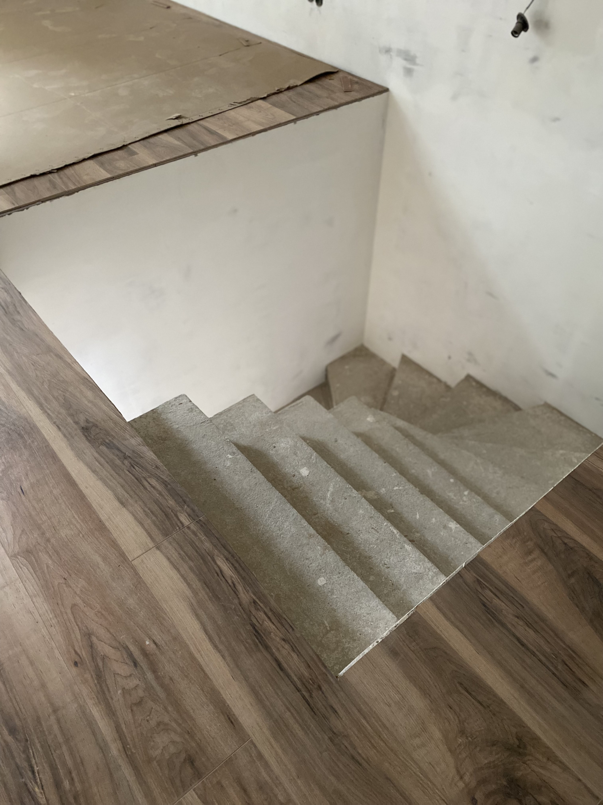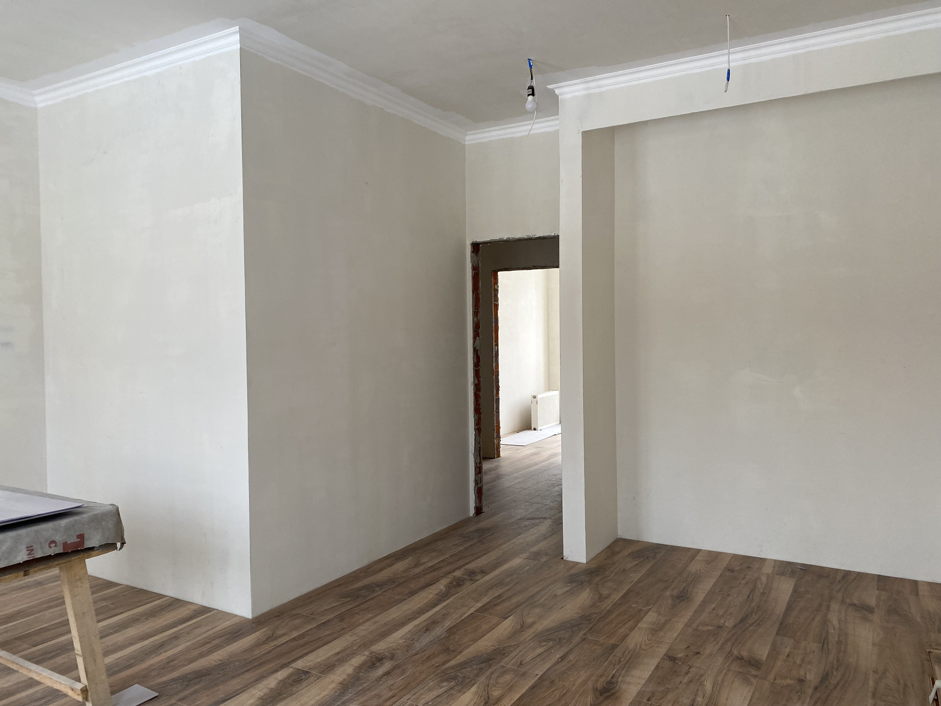 - произведена стяжка пола + напольное покрытие (керамогранитная плитка, ламинат),
