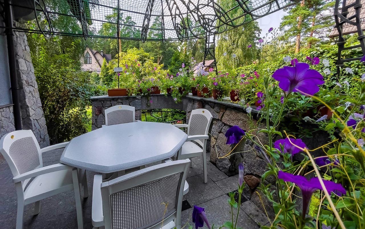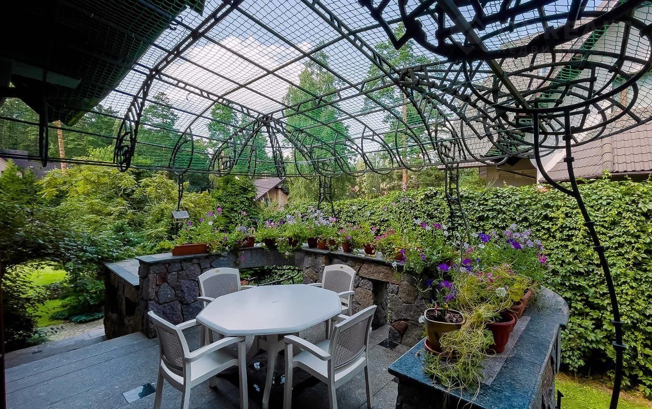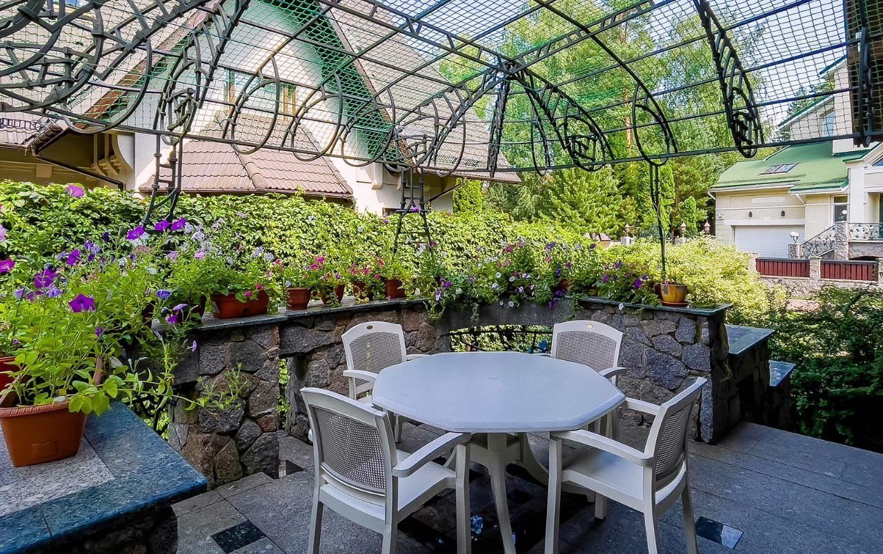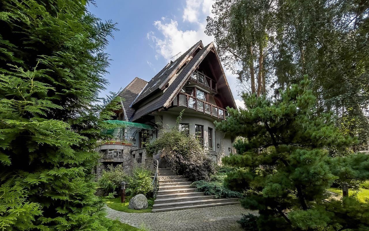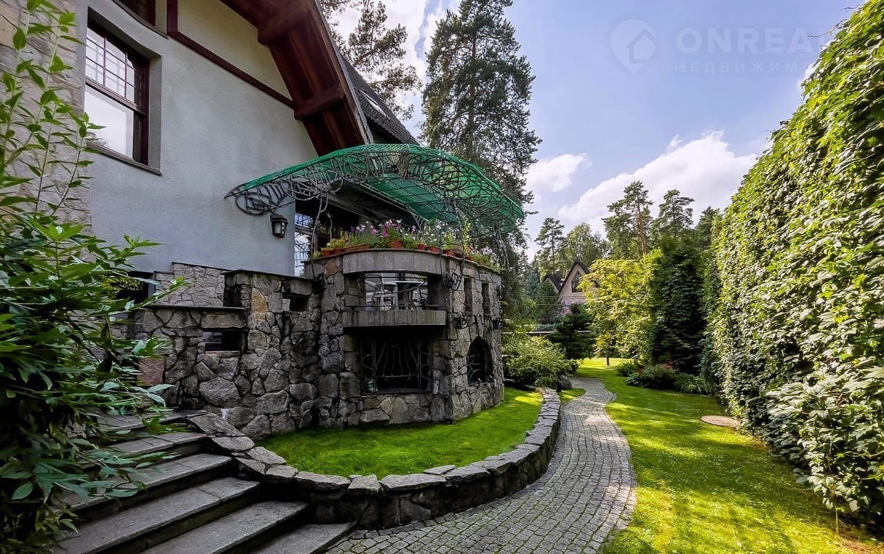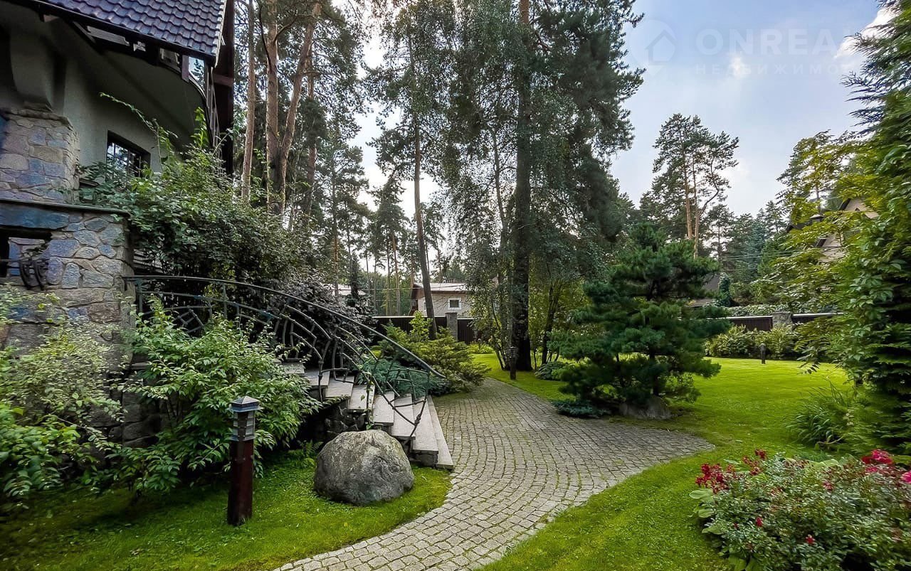 Участок с ландшафтным дизайном и лесными деревьями 19 соток, здесь расположены гараж с блоком на втором этаже для охраны и персонала, летняя беседка и стоянка для автомобилей.