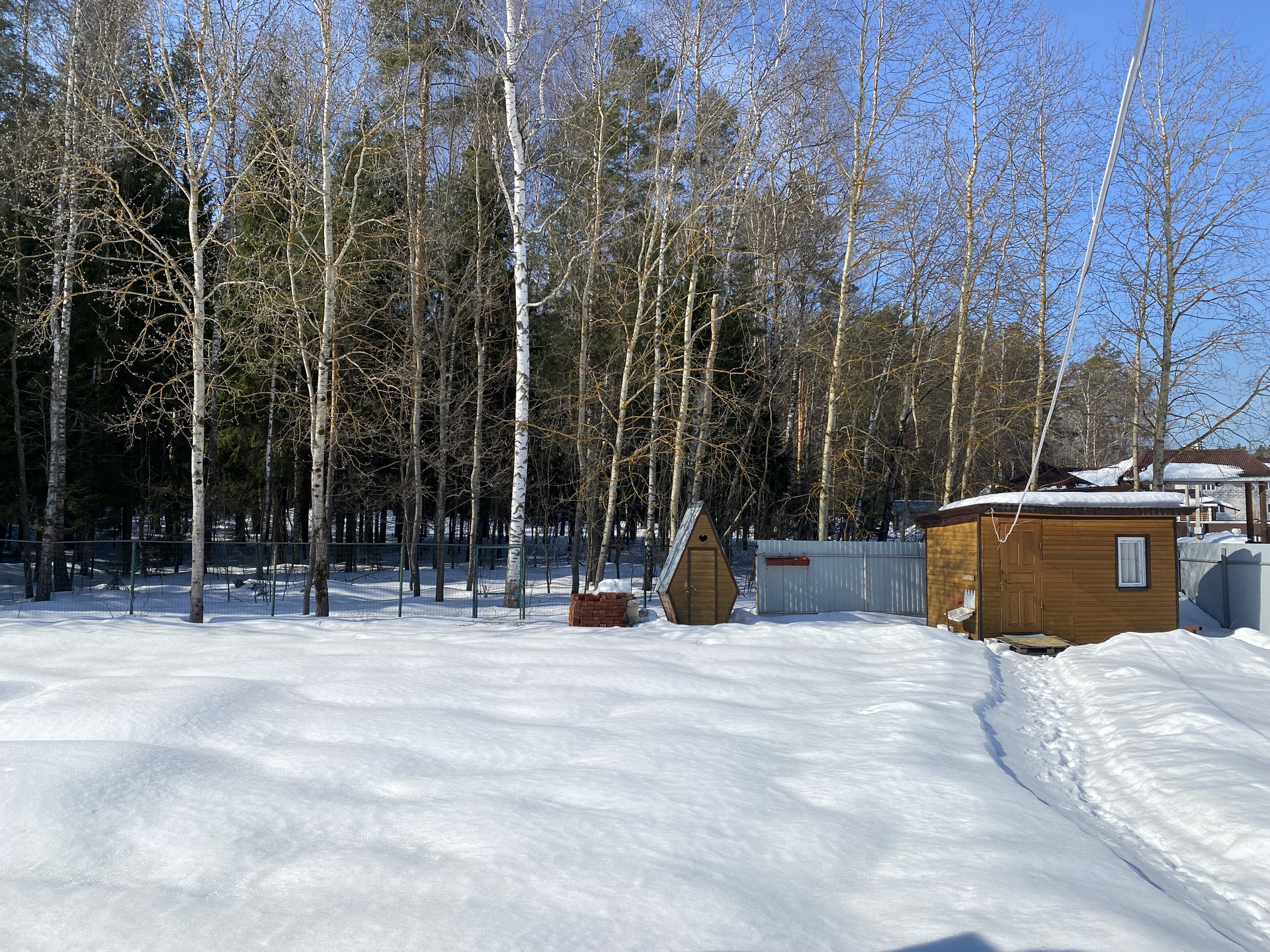Участок ровный, сухой, правильной формы, огорожен хорошим забором, есть ворота и дополнительная калитка с выходом в лес.