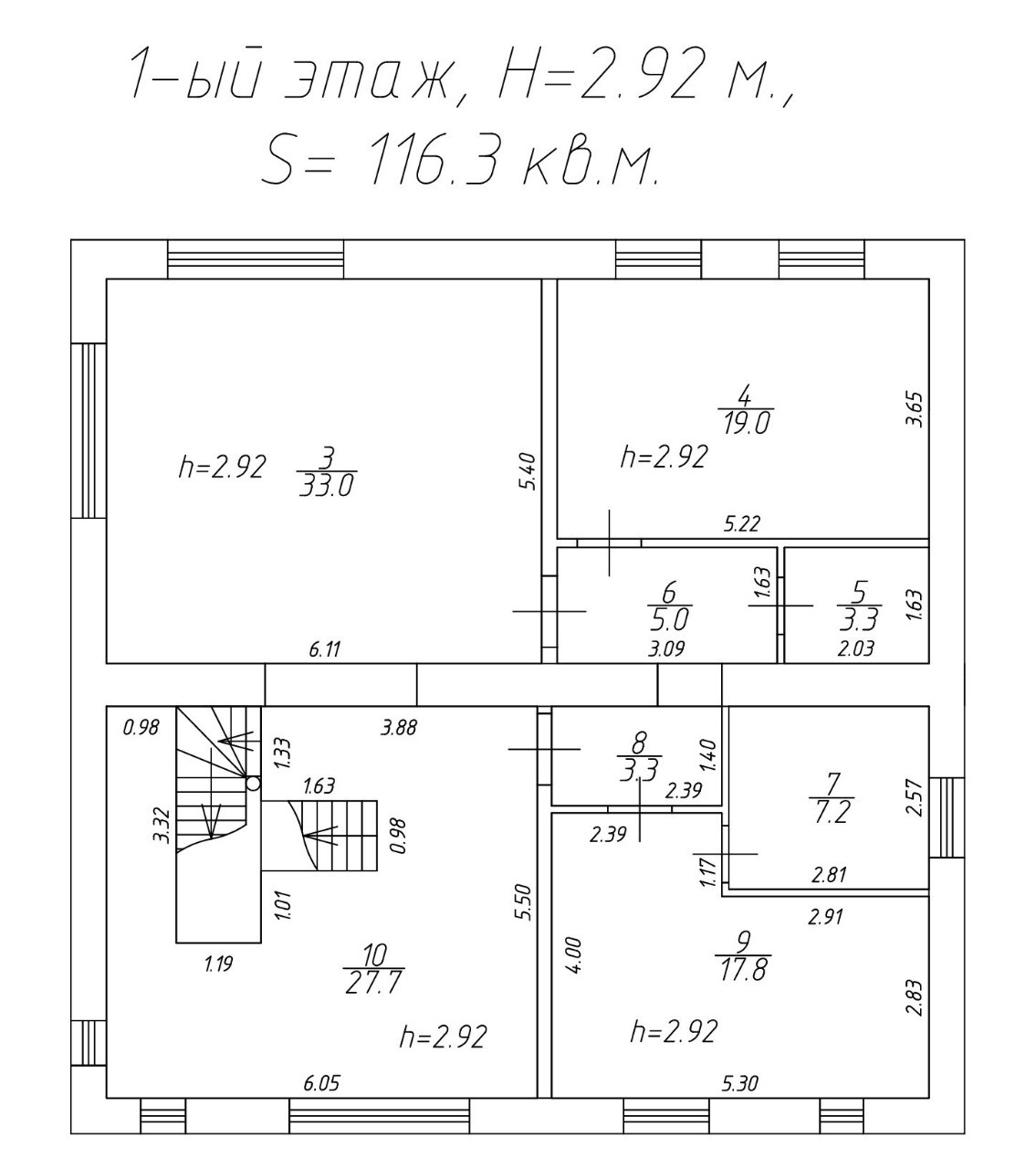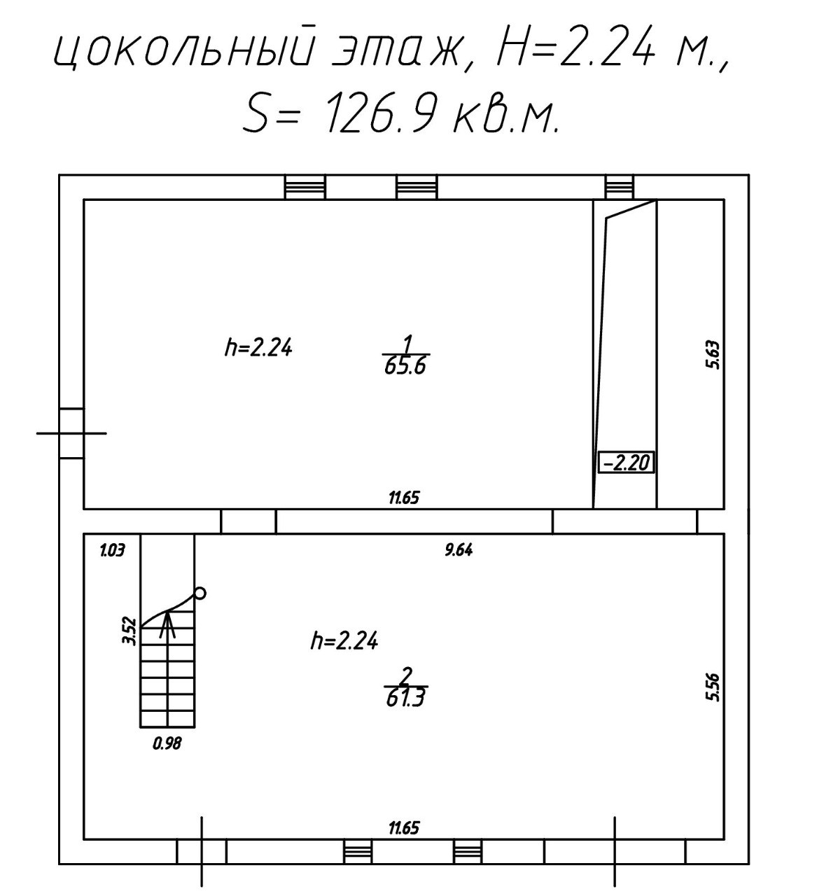 Первый этаж (цокольный):126,9кв.м. имеет два помещения 61,3 кв.м. и 65,6 кв.м., место для парковки автомобиля и спуск в подвал.