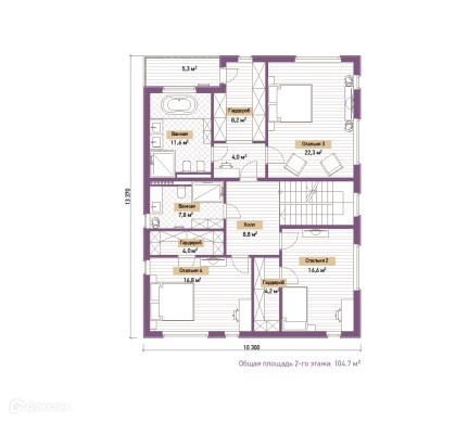Второй этаж, площадью 104,7 м2 предусматривает 2 большие спальные комнаты (16,8 м2 + 16,6 м2) со своими гардеробными (по 4 м2) и общим с/у (7,8 м2). Почти половину второго этажа занимает хозяйская комната, которая включает в себя: спальную зону (22,3 м2), гардероб (8,2 м2), ванную комнату (11,6 м2). Семья из 4 человек будет чувствовать себя максимально комфортно в таком функциональном доме!