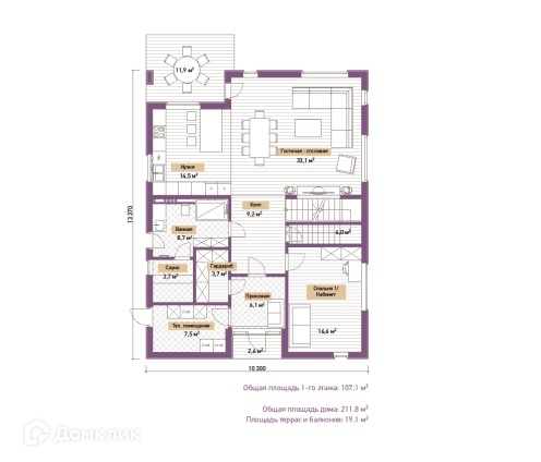 Итак, дом общей площадью 212 м2 (площадь террас и балконов – 19 м2) превосходно подойдет для семьи из 3-4 человек! Планировка дома функциональна и продумана, благодаря многолетнему опыту строительства подобных домов, и этого проекта в частности. Первый этаж, площадью 107 м2, предусматривает: большую гостиную со столовой зоной (33 м2); благодаря большой площади остекления (окна в пол) помещение всегда будет наполнено светом(!); кухня (14,5 м2) является логичным продолжением столовой зоны; обязательный стандарт современных загородных домов – ванная комната первого этажа (8,7 м2), где можно обустроить и сауну (3,7 м2), и гостевая спальня или кабинет (16,6 м2); при входе расположена прихожая (4,6 м2), гардеробная (3,7 м2); холл (9,2 м2); техническое помещение (котельная 7,5 м2) предназначено не только для размещения инженерного оборудования, но и может использоваться как прачечная.