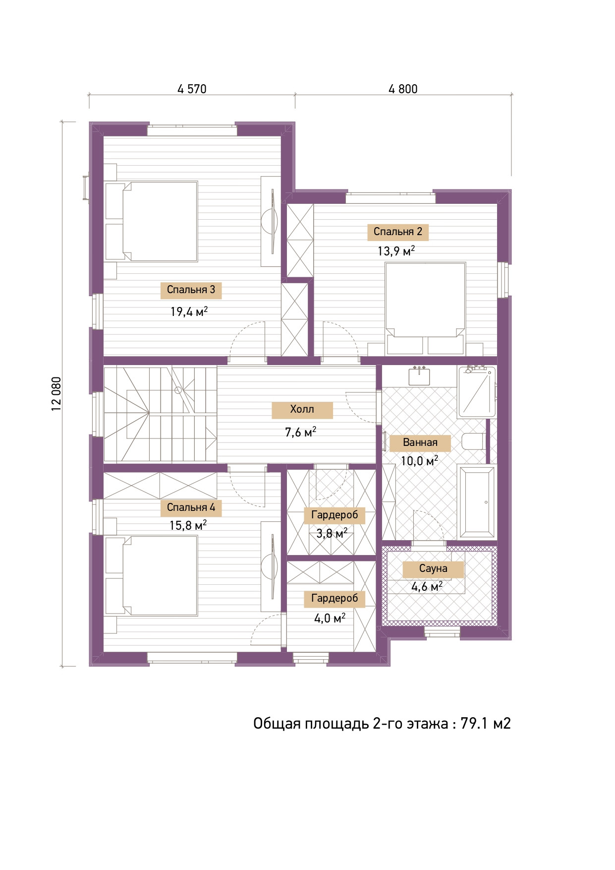 Второй этаж 79,1 кв.м.: спальня №2 14 кв.м., спальня №3 19,4 кв.м., ванная 10 кв.м., сауна 4,6 кв.м., гардеробная 3,8 кв.м., спальня №4 15,8 кв.м., гардеробная 4 кв.м.