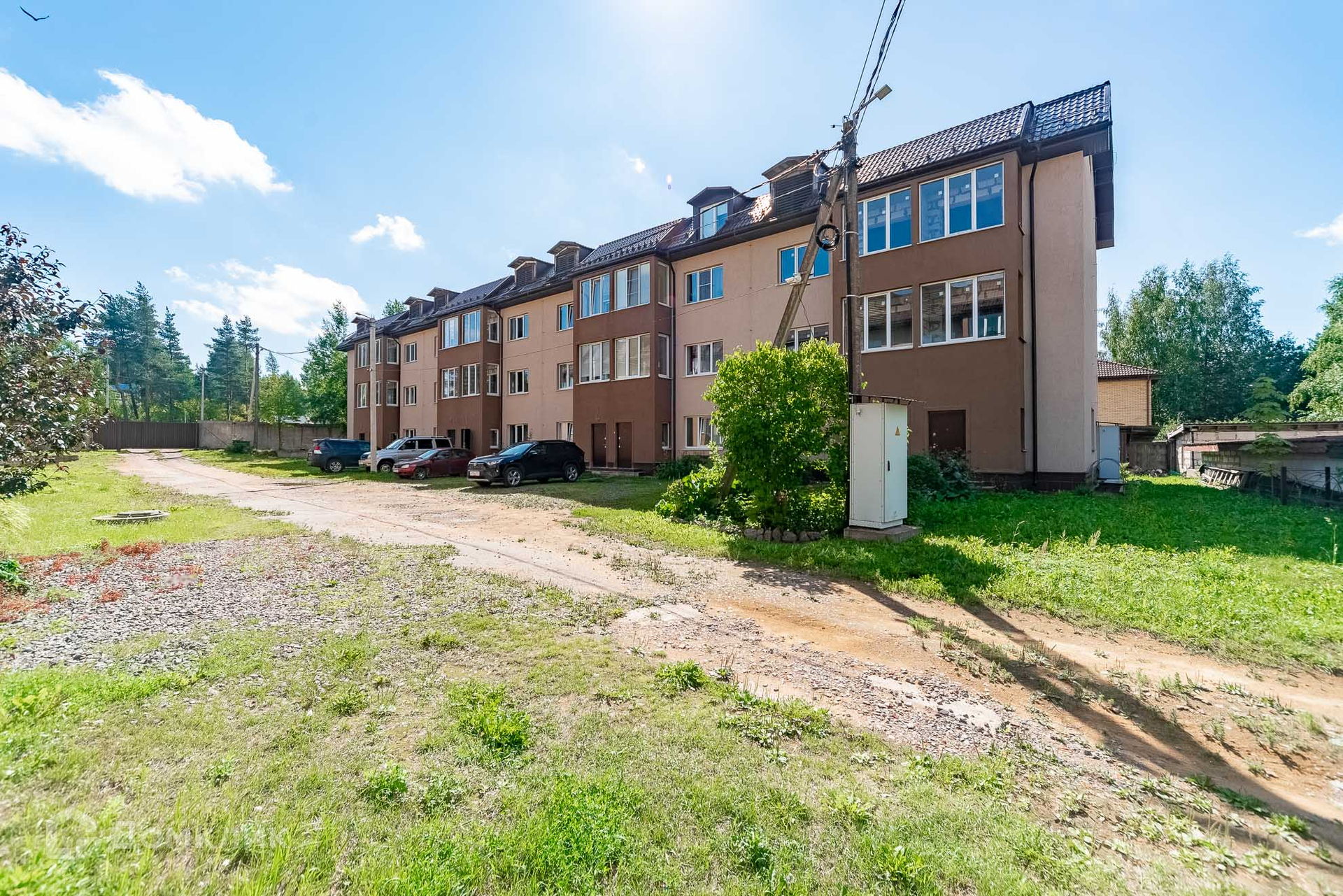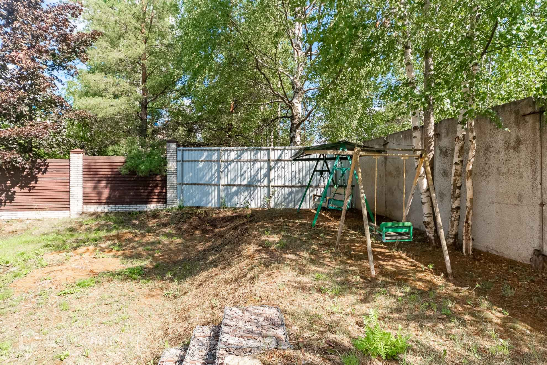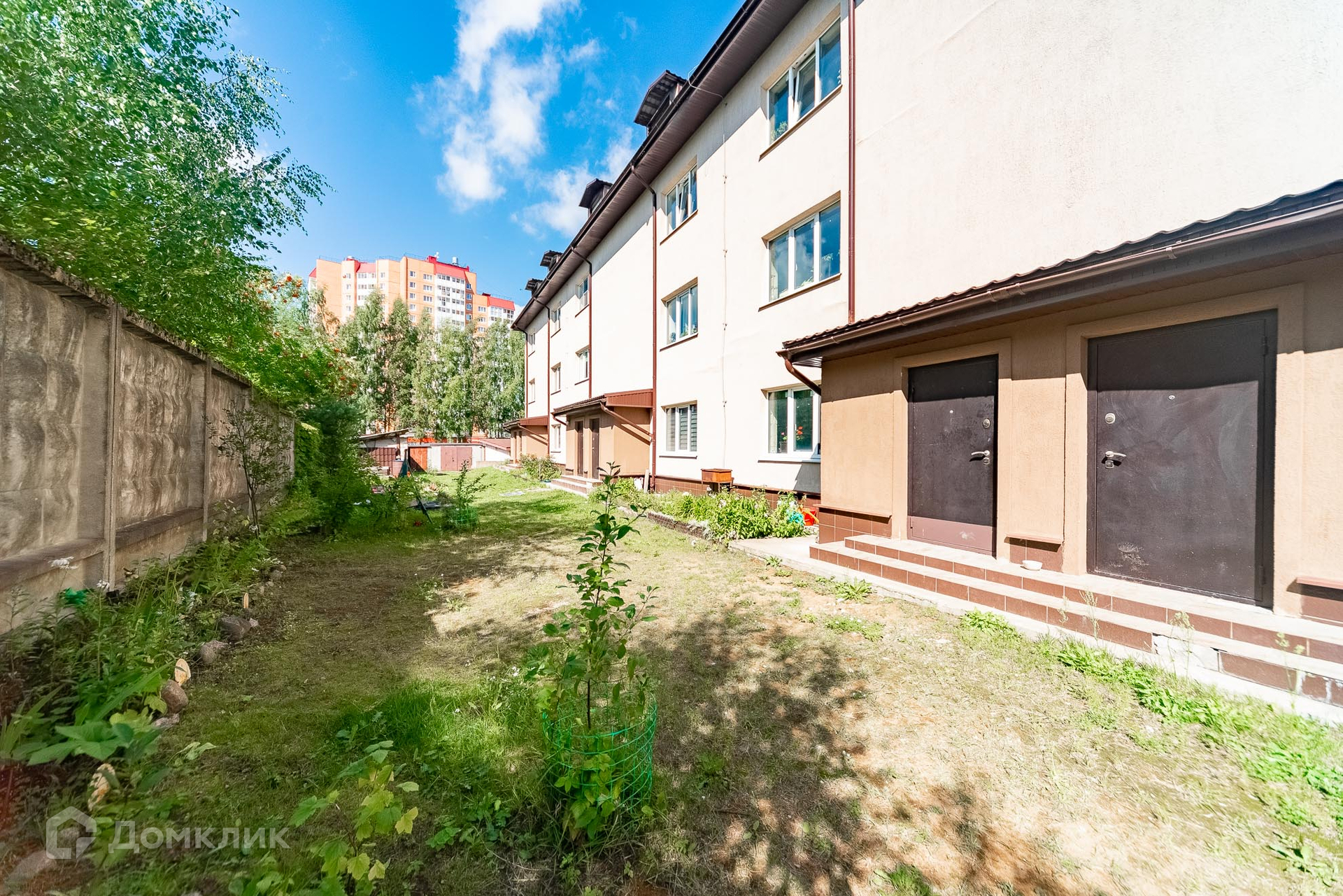 Общая территория в 50 соток полностью закрытая, въезд через закрытые ворота по пульту, на ней стоит 2 одинаковых таун-хауса на 16 семей, у каждого свой мини-участок, гараж. Свободная парковка, есть детская площадка, есть запасной выход.