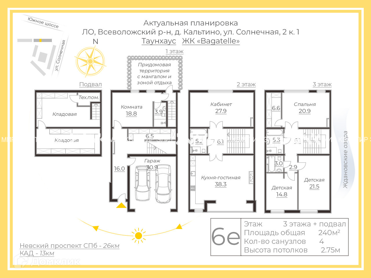 Таунхаус имеет три жилых этажа, подвальное помещение,