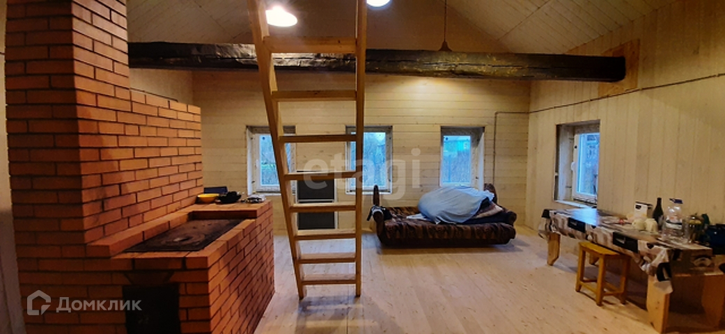 В основной комнате сделан ремонт: поменяны окна, стены обшиты вагонкой, организовано пространство типа второй свет, на котором располагается спальня, установлены декоративные балки. В доме есть прекрасная новая печь, которая является как элементом интерьера, так и источником тепла, так же на ней можно готовить пищу.