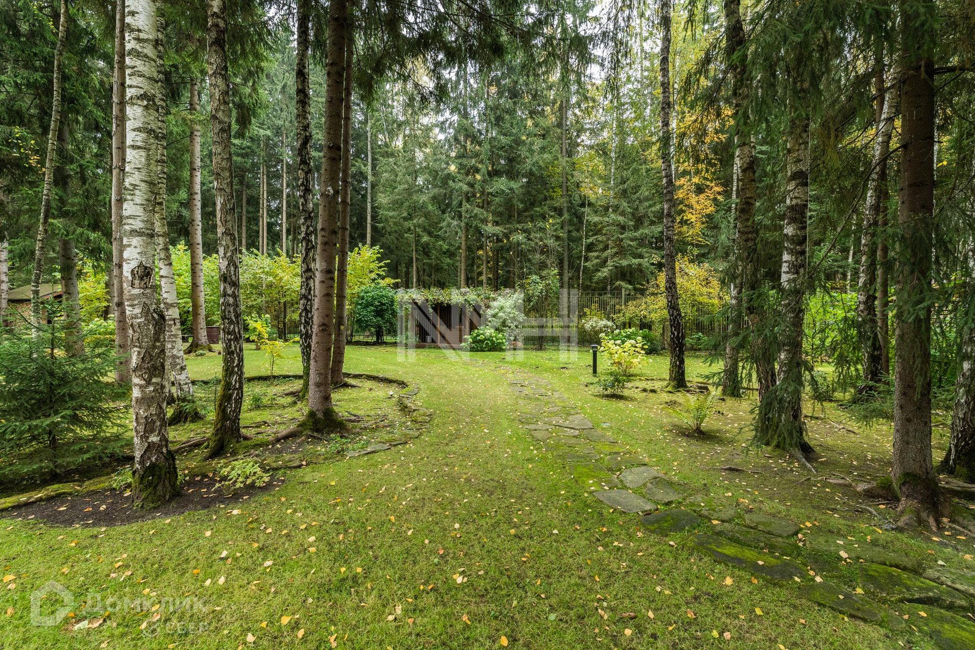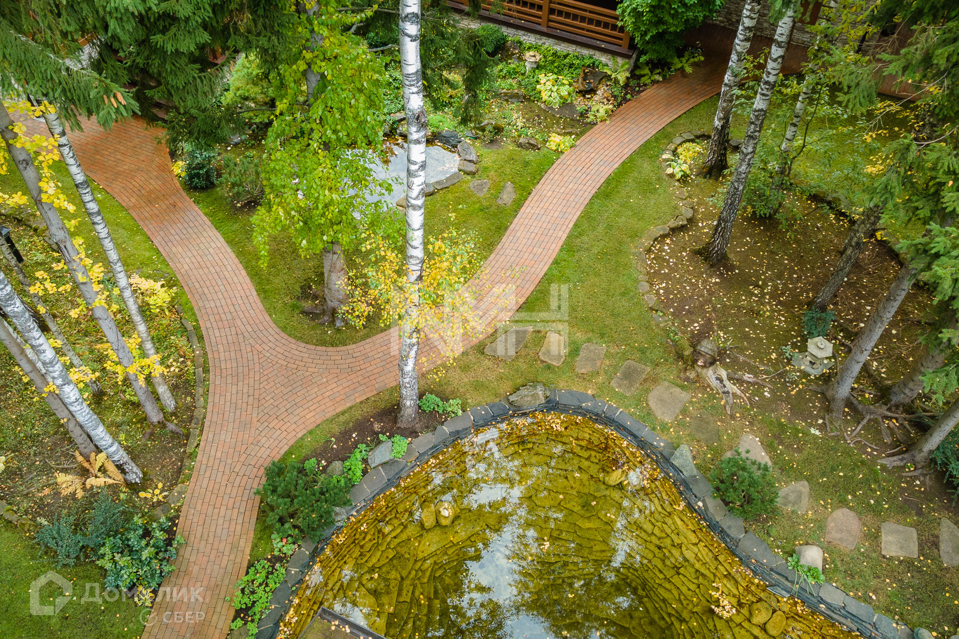 Участок 32 сотки имеет природный лесной ландшафт, два пруда, сад, прогулочные дорожки, свой выход в лес, парковку на 3 а/м, ограждение в едином поселковой стиле.