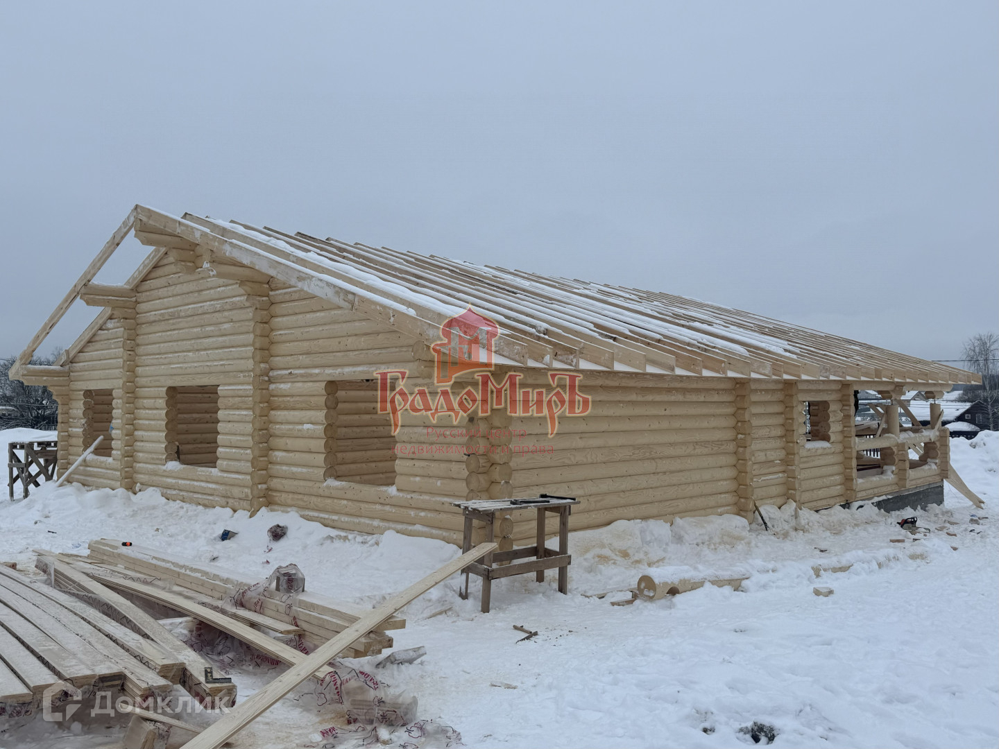Дом в процессе строительства. В настоящее время возведён сруб и установлены стропила. Удачный проект дома от проверенного временем застройщика.