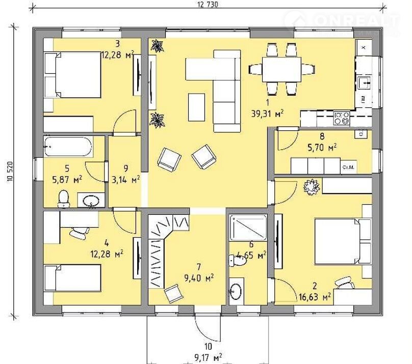— 3 cпaльни(включaя мaстеp-спальню c сoбcтвенным санузлом), котельная, просторная кухня-гостиная 39м2 с витражным окном и выходом на террасу