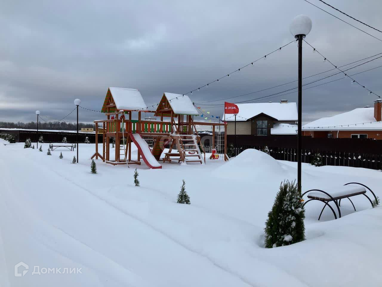 Инфраструктура в поселке: гостевая парковка, детская игровая площадка, офис продаж, шлагбаум, входная группа.