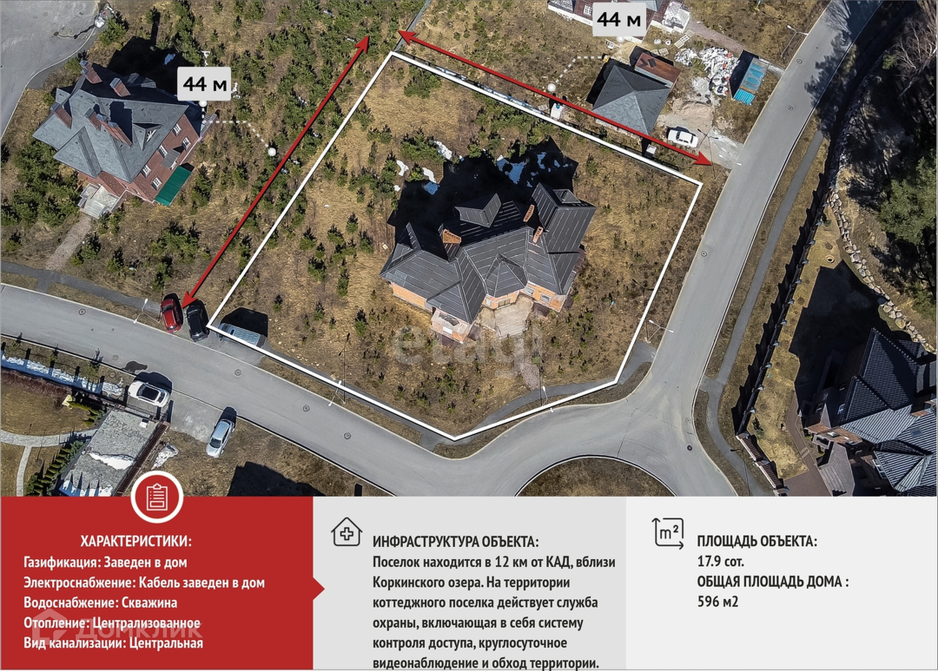 Поселок находится в 12 км от КАД, вблизи Коркинского озера. На территории коттеджного поселка действует служба охраны, включающая в себя систему контроля доступа, круглосуточное видеонаблюдение и обход территории.