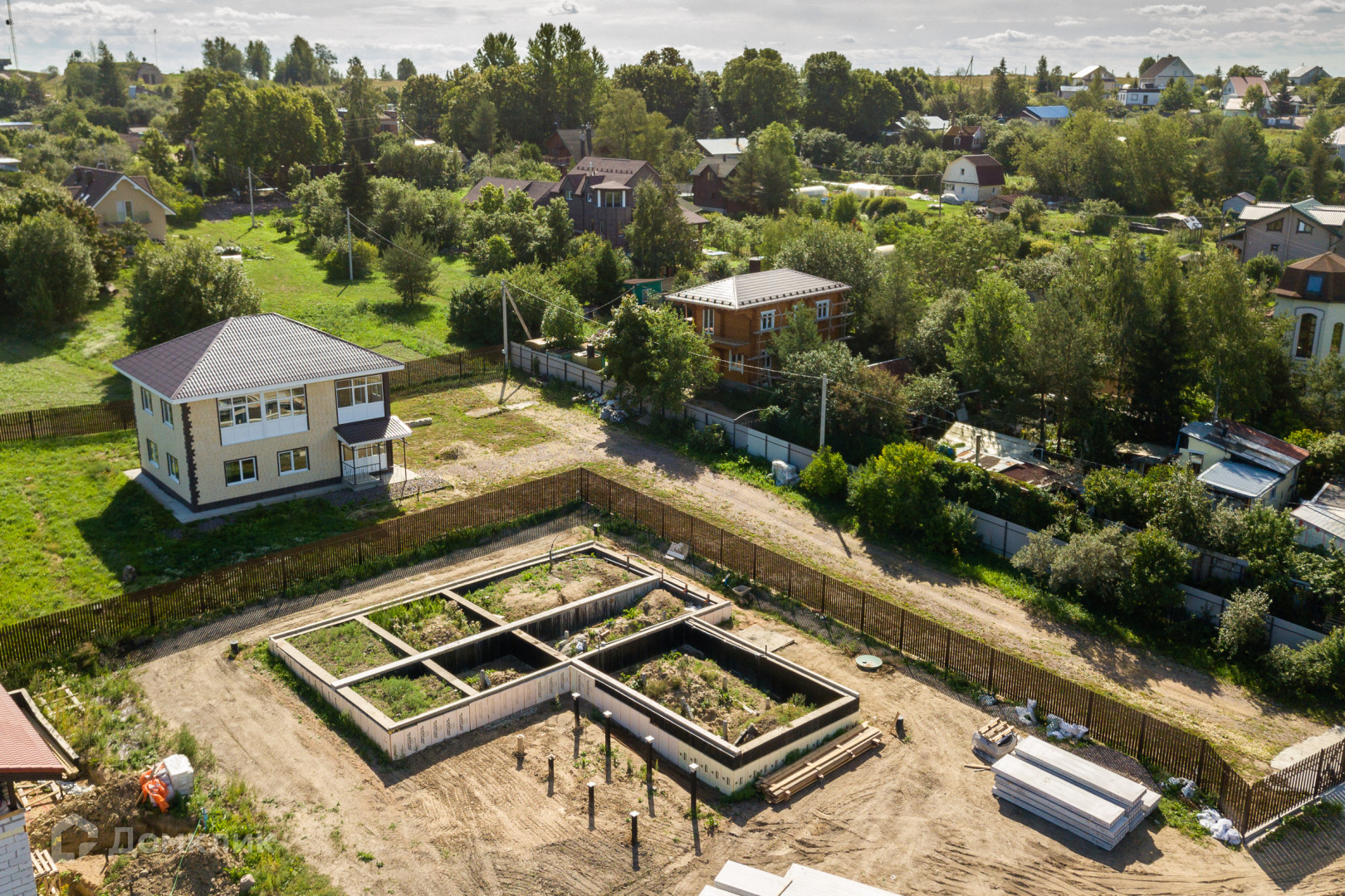 Фундамент монолитная плита, стены - газобетон D500, крыша - металлочерепица.