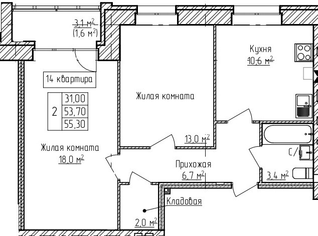 Общая площадь 55.3 м2