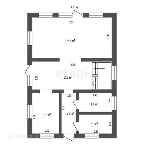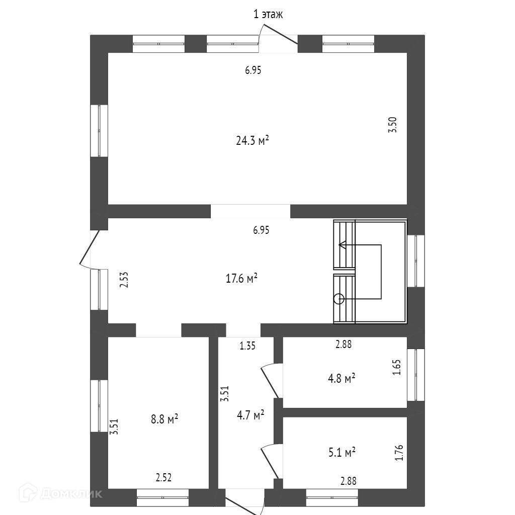 На первом этаже кухня столовая с панорамным выходом 8,8 м2 и 17,6 м2. Гостиная 24,3 м2 с панорамными окнами и с выходом на террасу. Бойлерная и санузел.
