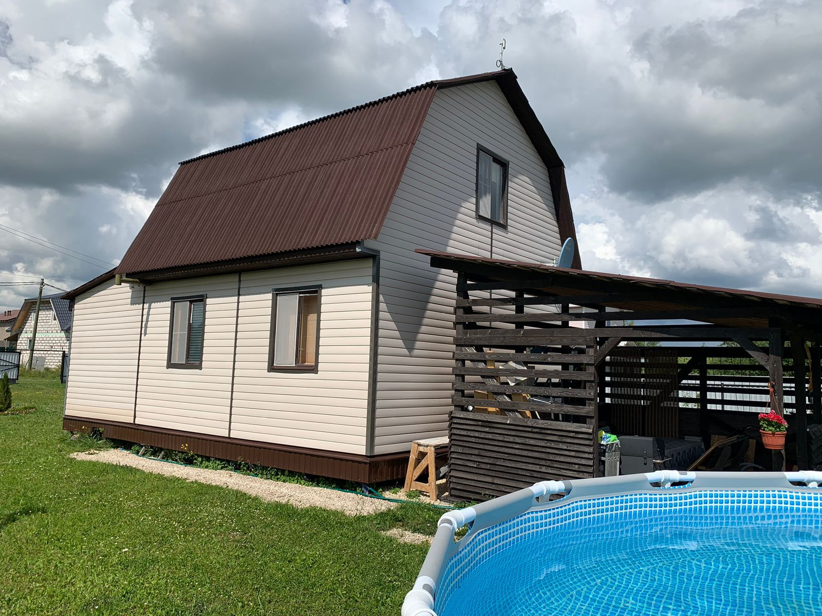 Дополнительный уличный торфяной туалет. Забор из профлиста. Бассейн: каркасный 4.57х1.2 м, обустроена ровная площадка, печь для обогрева (разогрев воды от +18 до +33 за полдня).